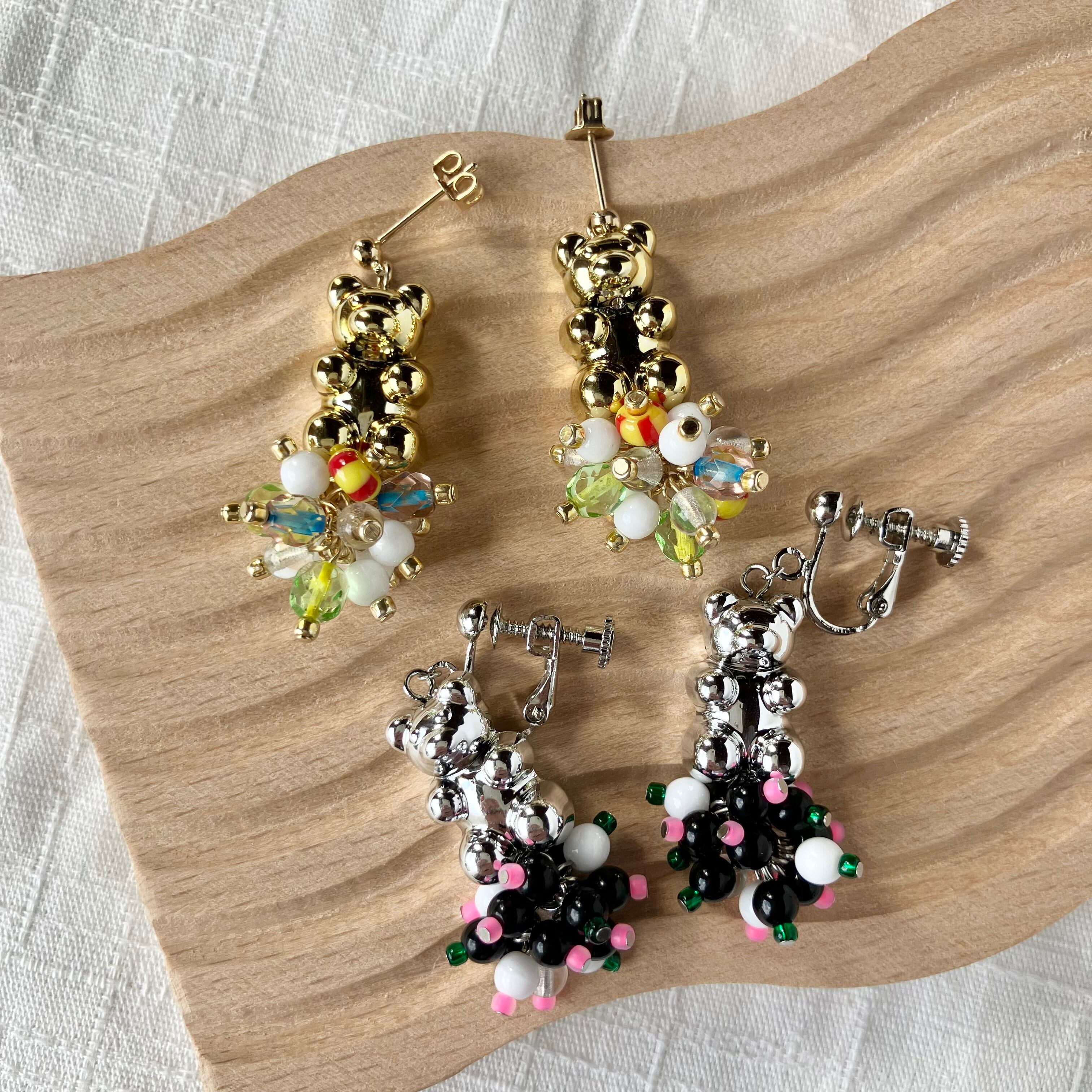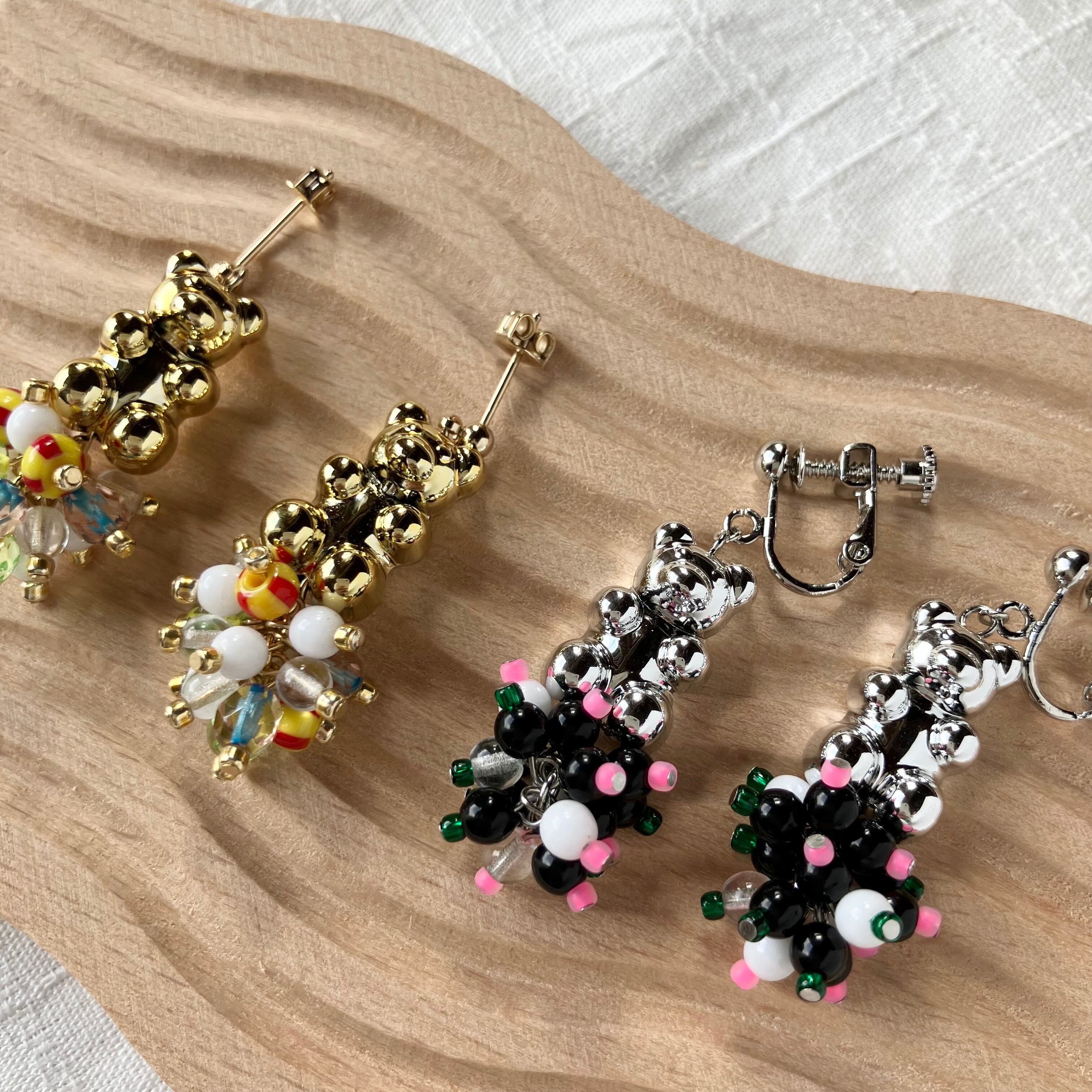 ゴールドのクマさんは、白とクリアにカラフルなビーズを合わせたハッピーな雰囲気。