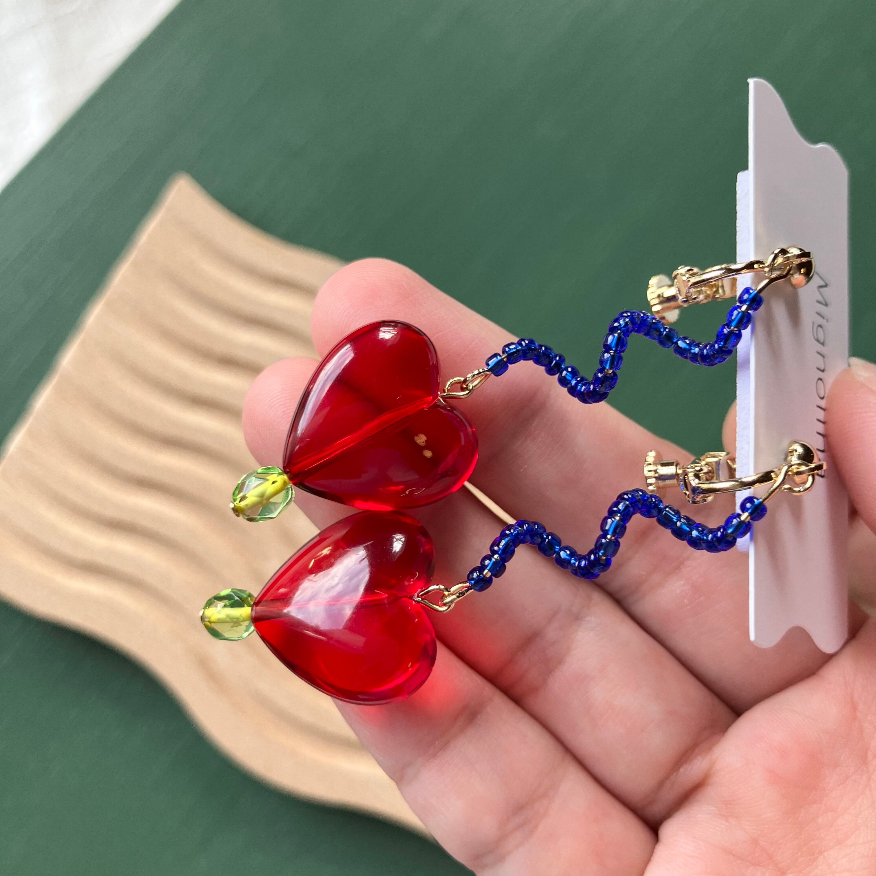 ツイストしたブルーのビーズと、クリアレッドのハート、先には明るい黄緑の小さなビーズを合わせています。
