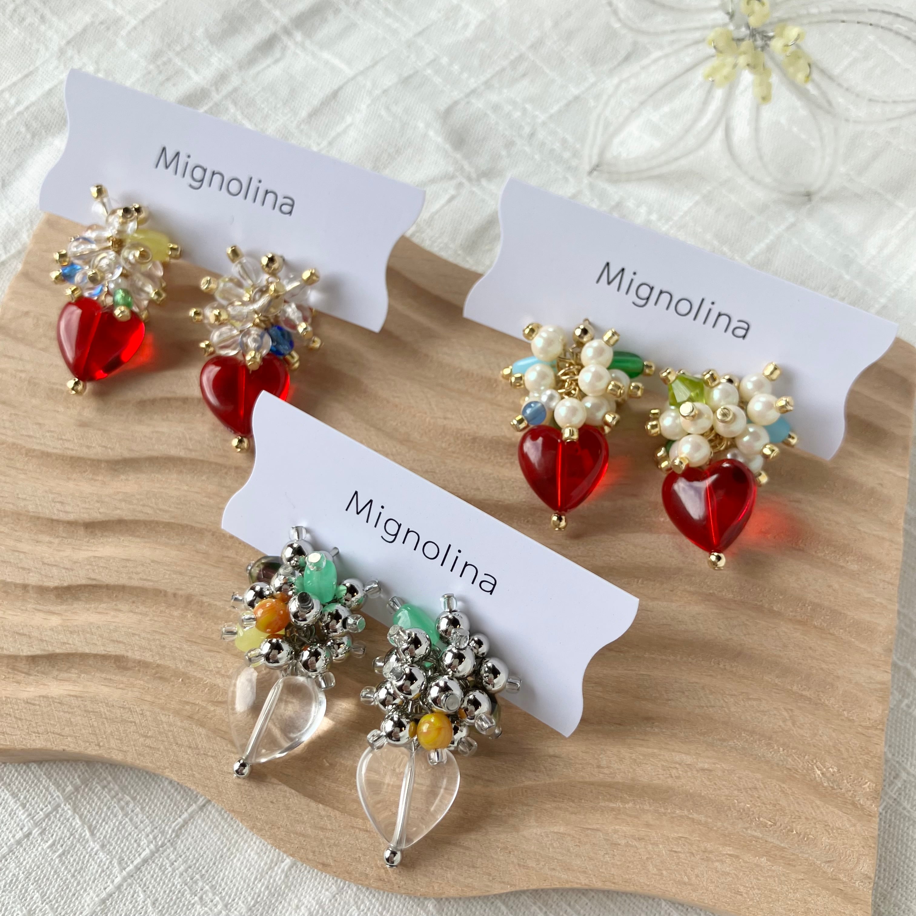 それぞれクリア、パール、シルバーを中心に、色んな色のビーズをちょこちょこと入れ込んで、可愛さもありつつカジュアルな服装にも合うアイテムになっています!