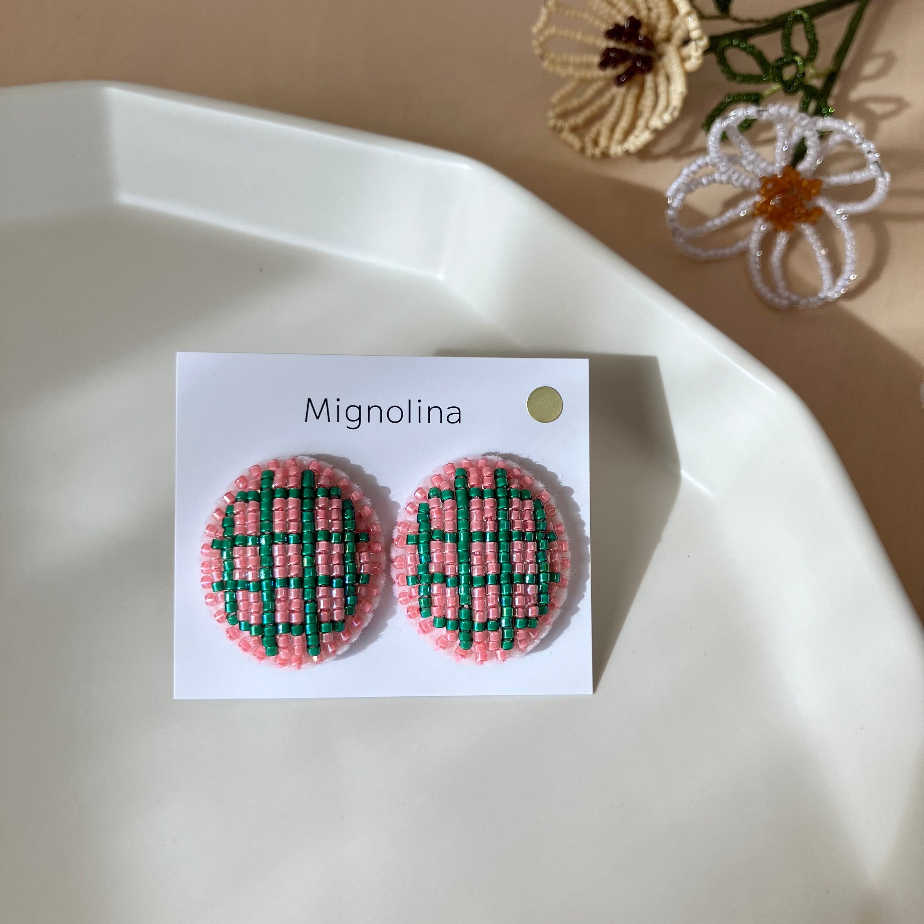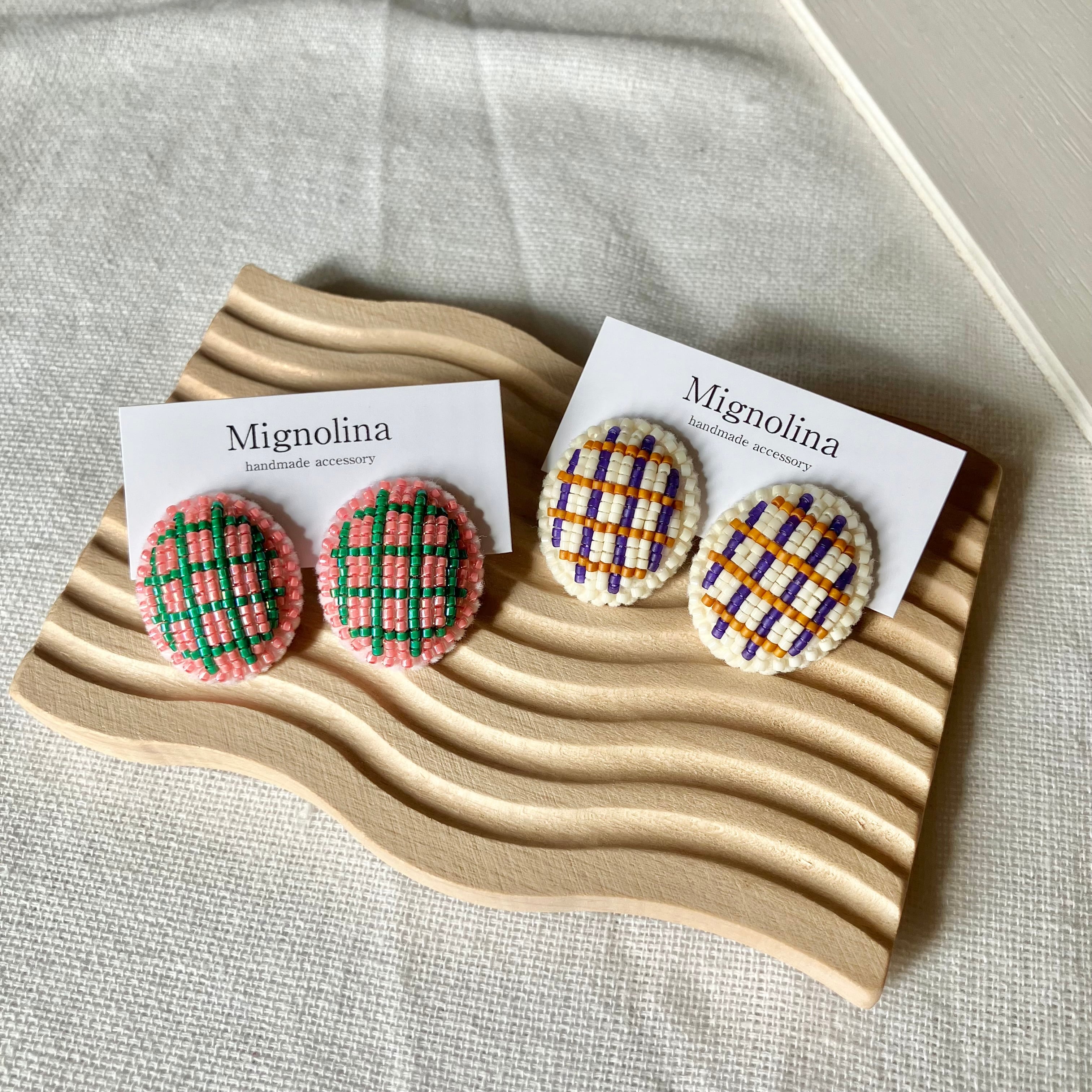 土台のフェルトにはわたを入れて、ぷっくりと立体的にビーズを刺繍しています。