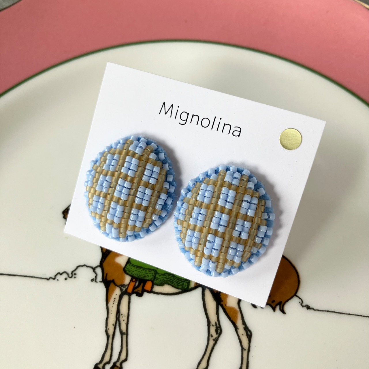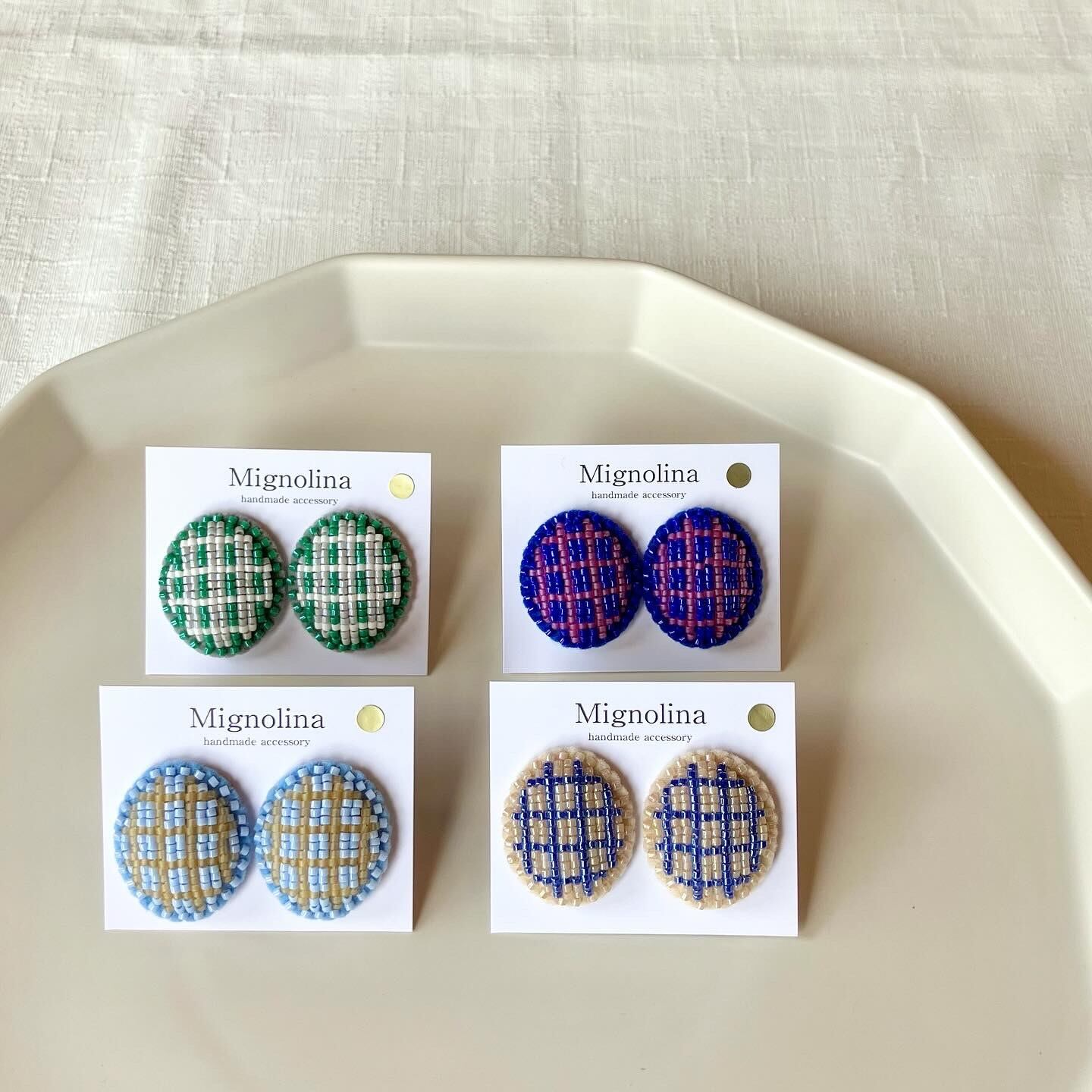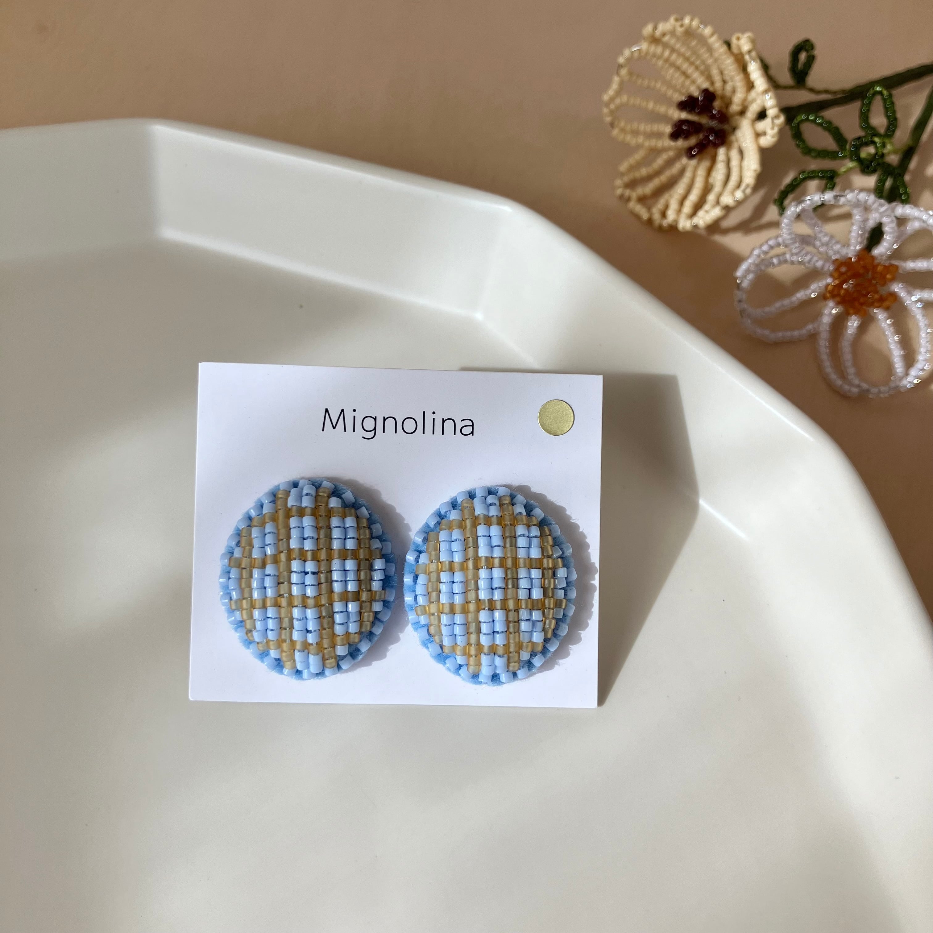 あじさいみたいな優しいブルーと薄いオレンジのチェック柄。