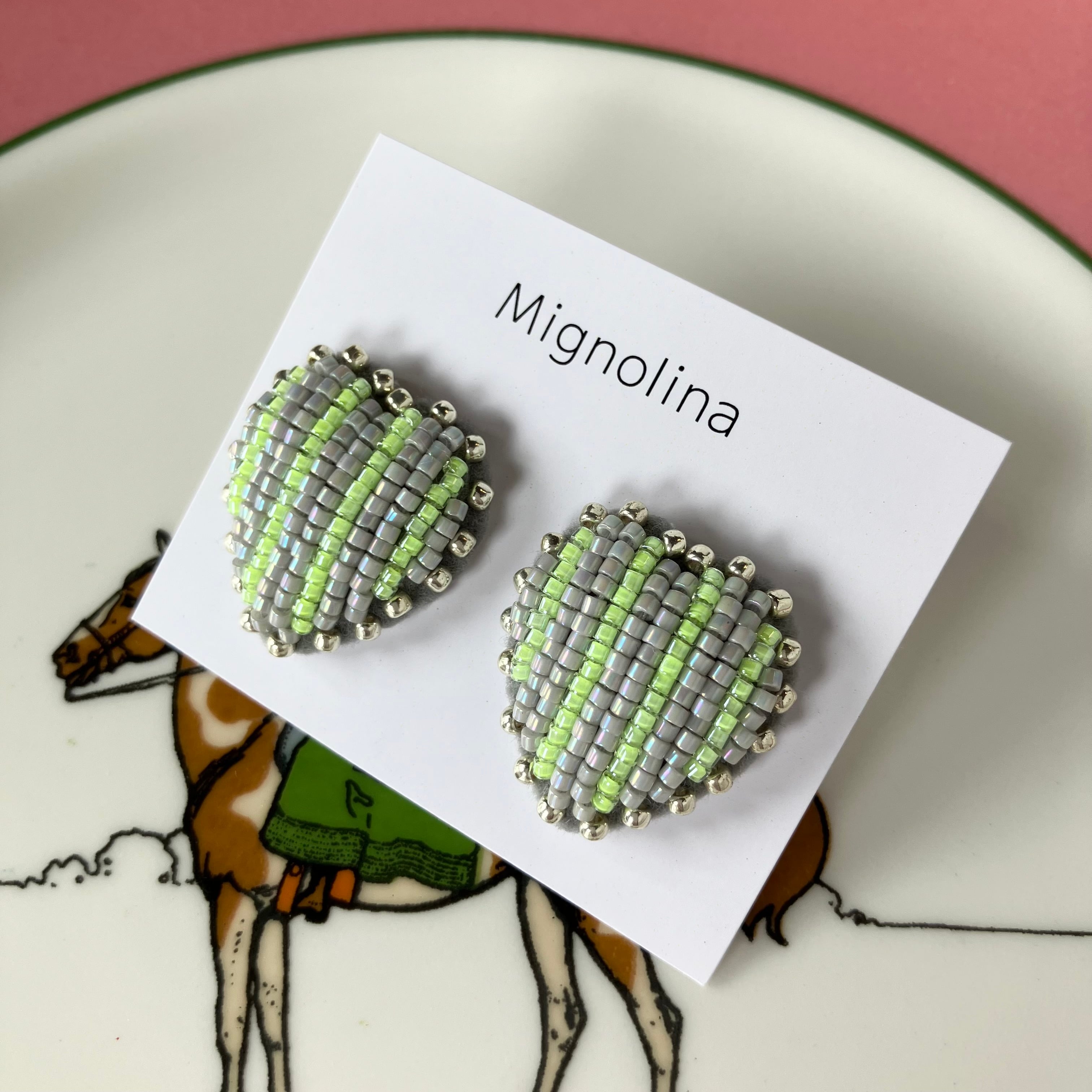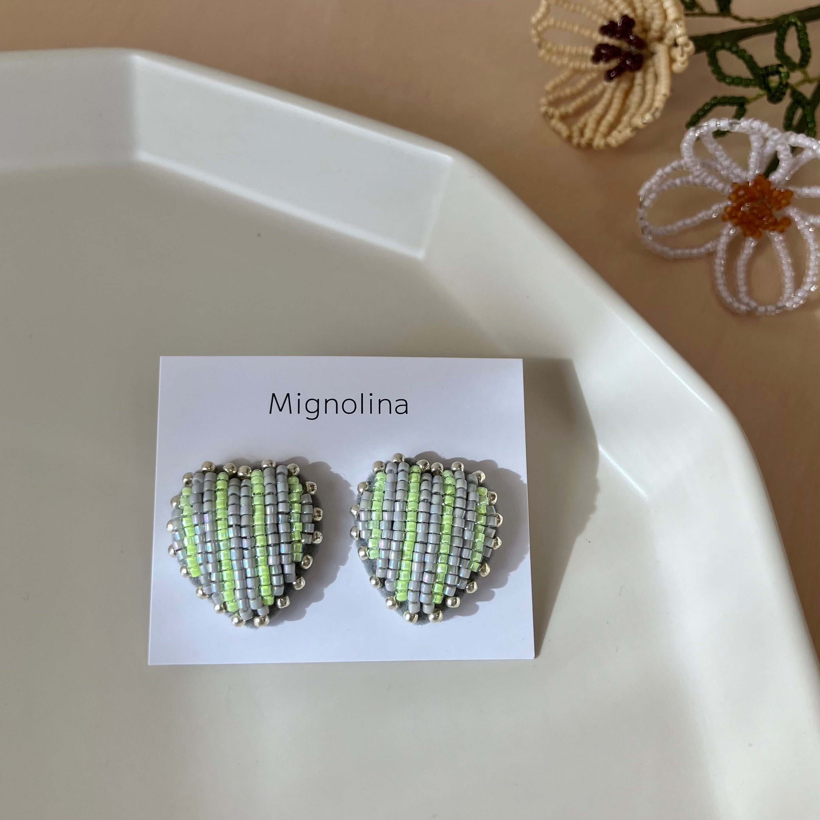グレーとネオンイエローのストライプ柄。ふちはシルバーのビーズで囲んでいます。