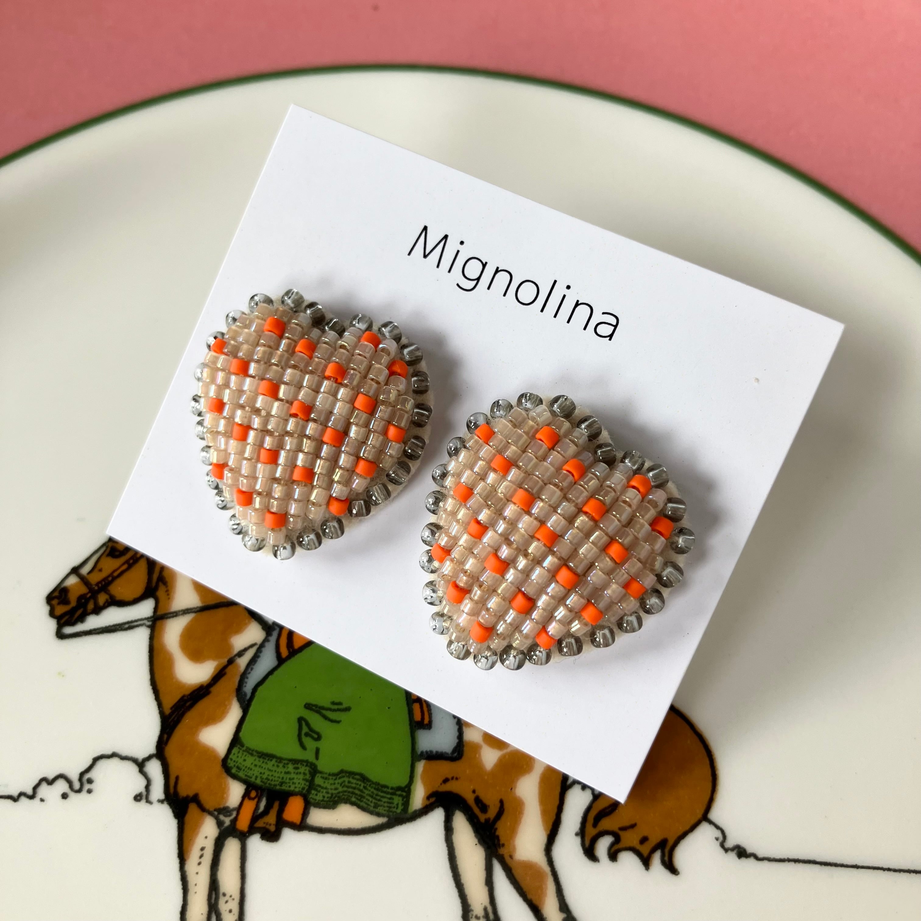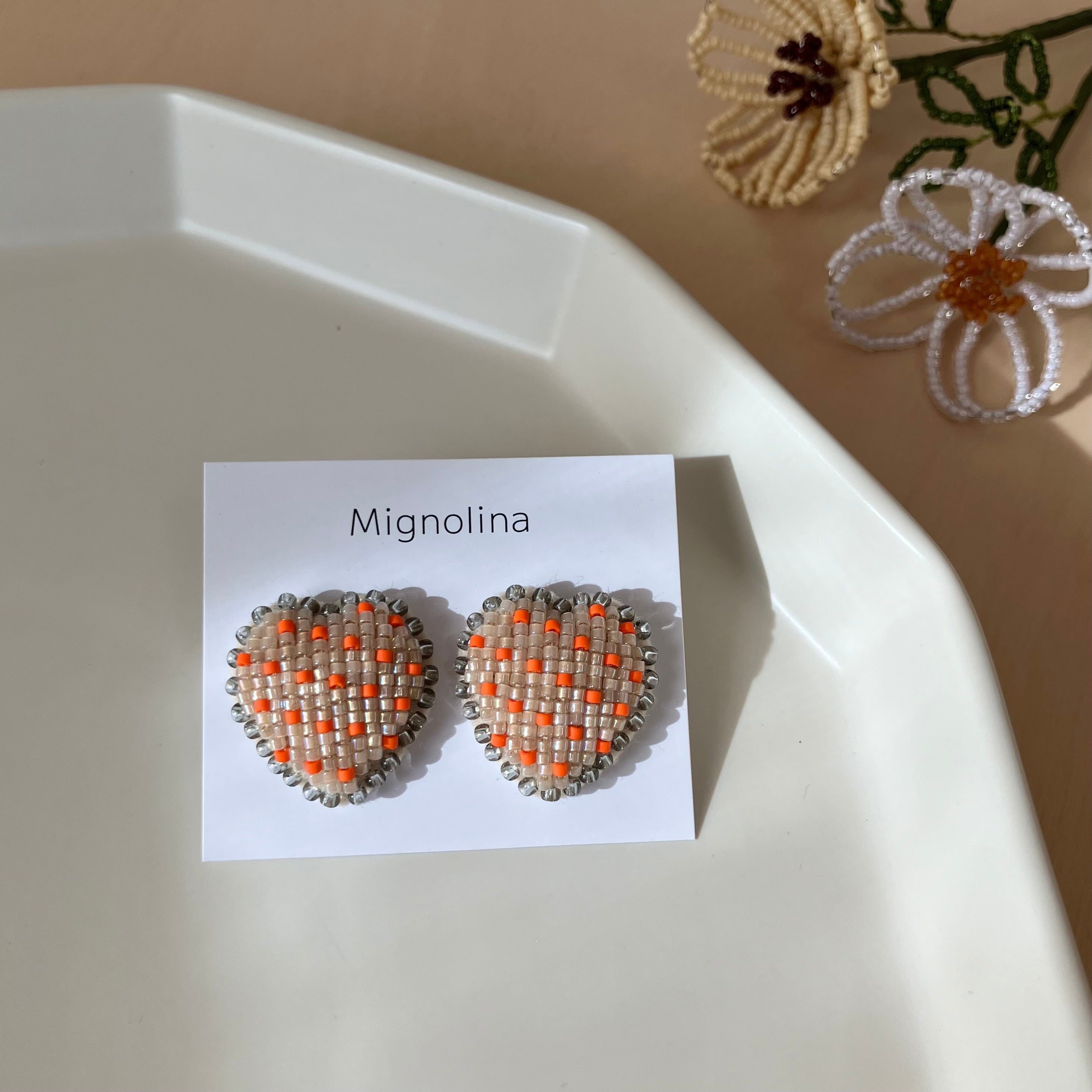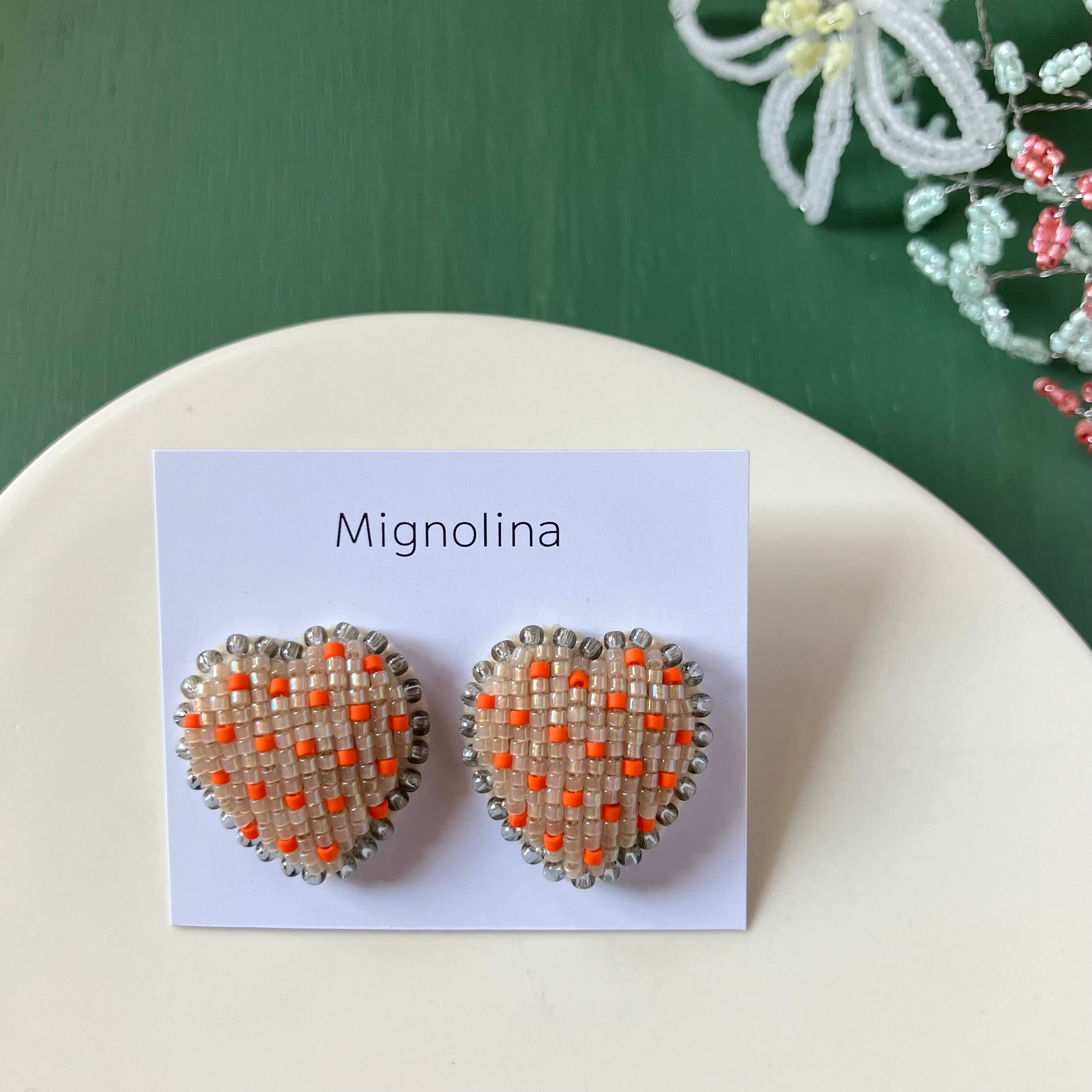 クリアベージュとビビットオレンジのドット柄。ふちはクリアグレーのビーズで囲んでいます。