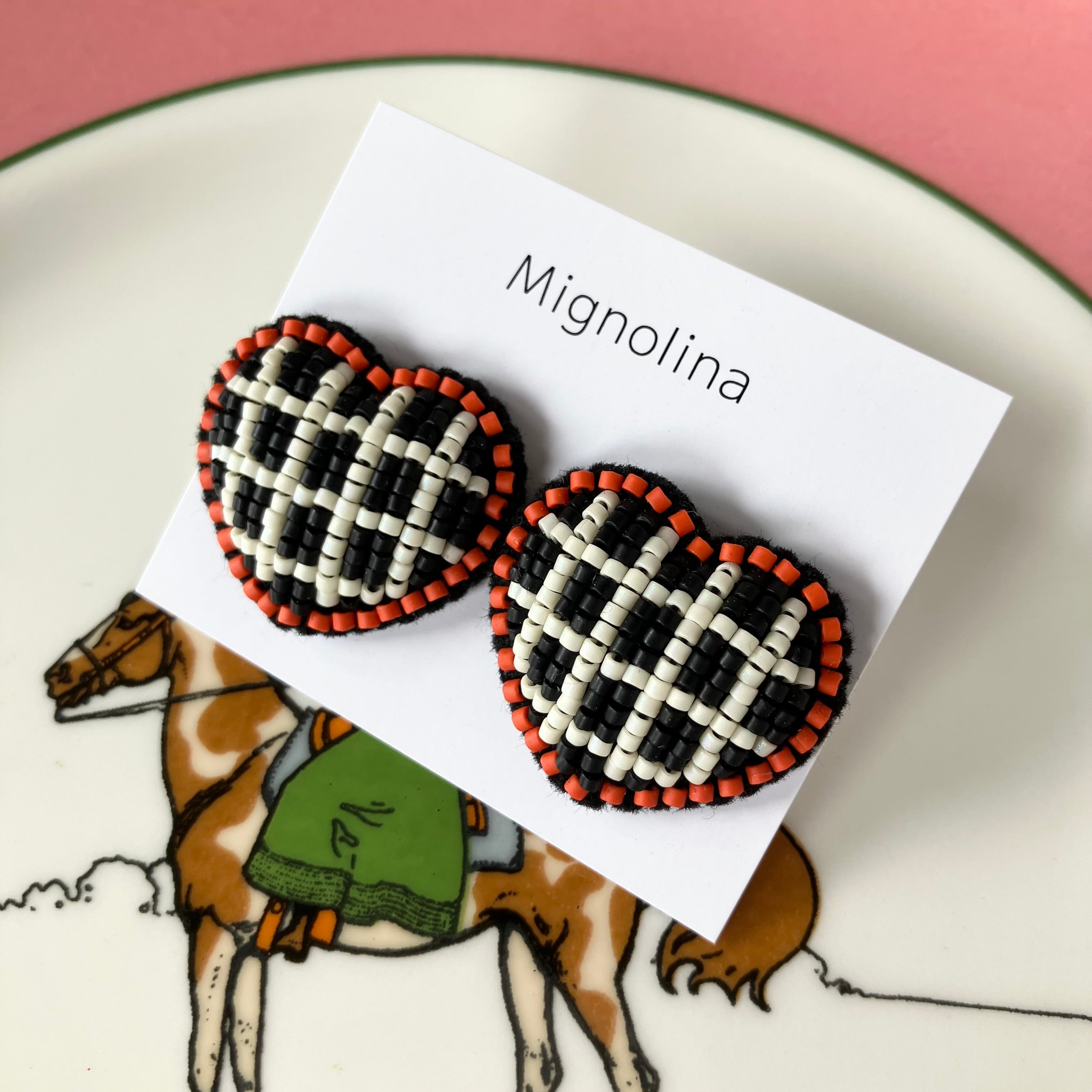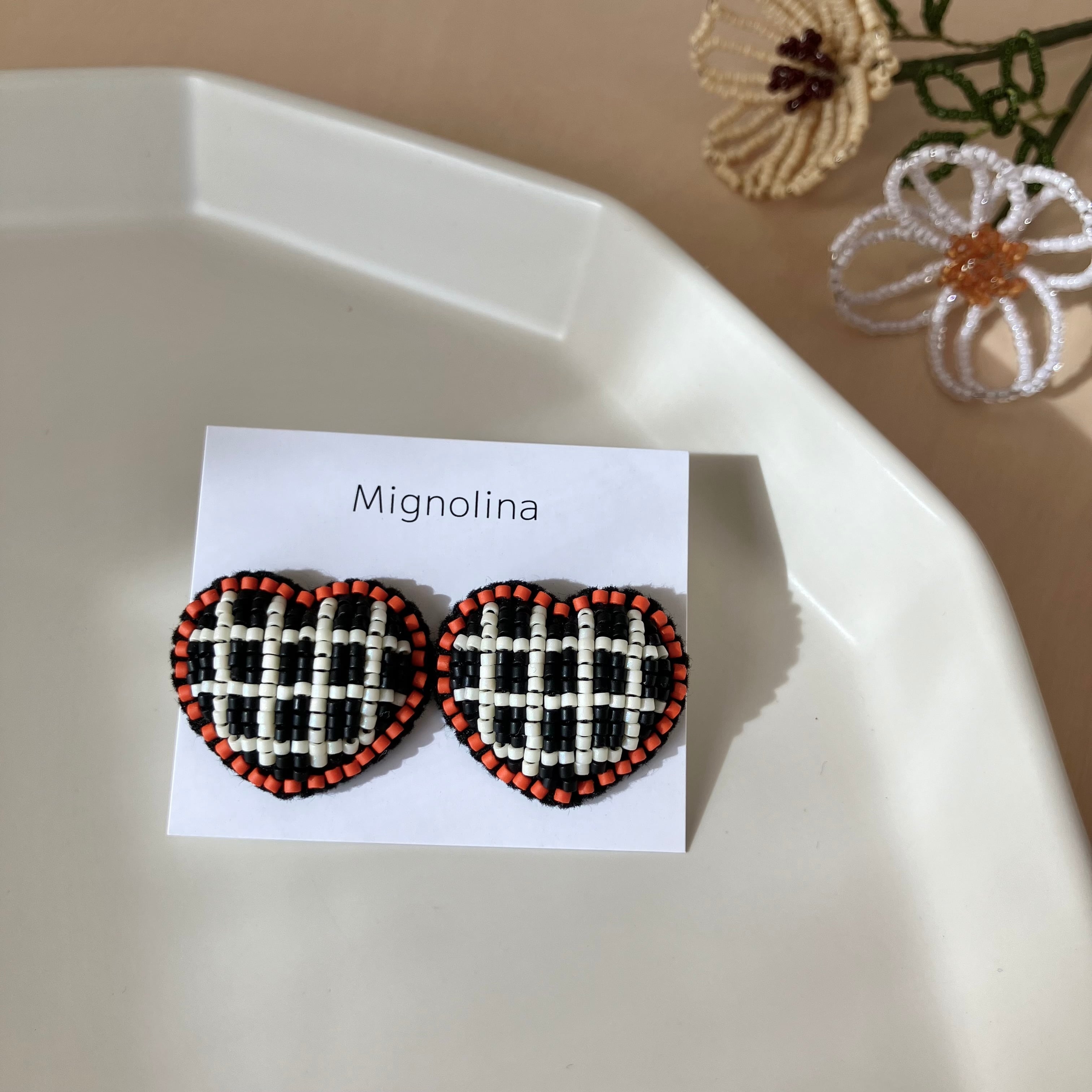 マットなブラックとクリームのチェック柄。ふちはマットな朱色のビーズで囲んでいます。
