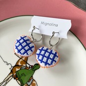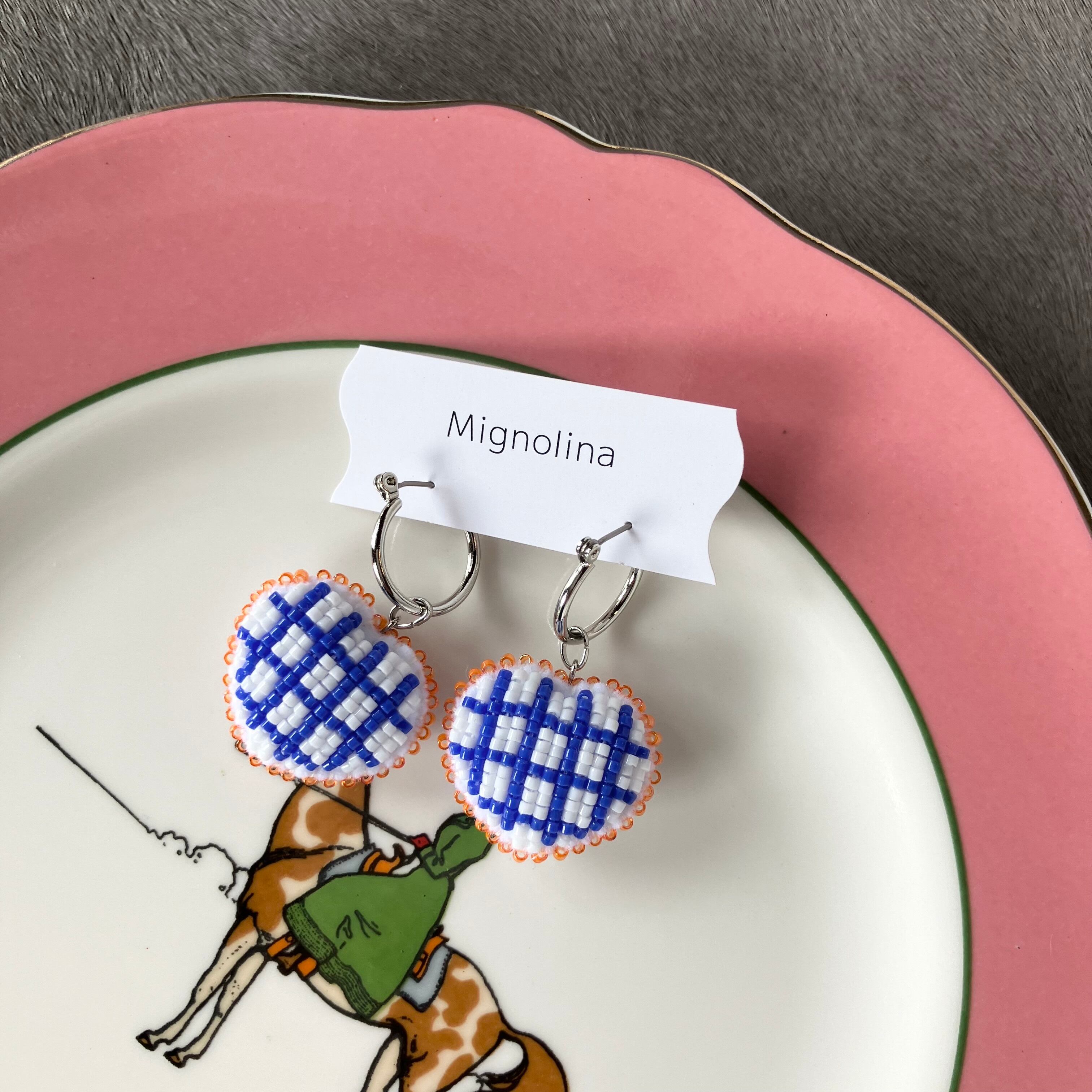 ホワイトとブルーのチェック柄ハートの耳飾り