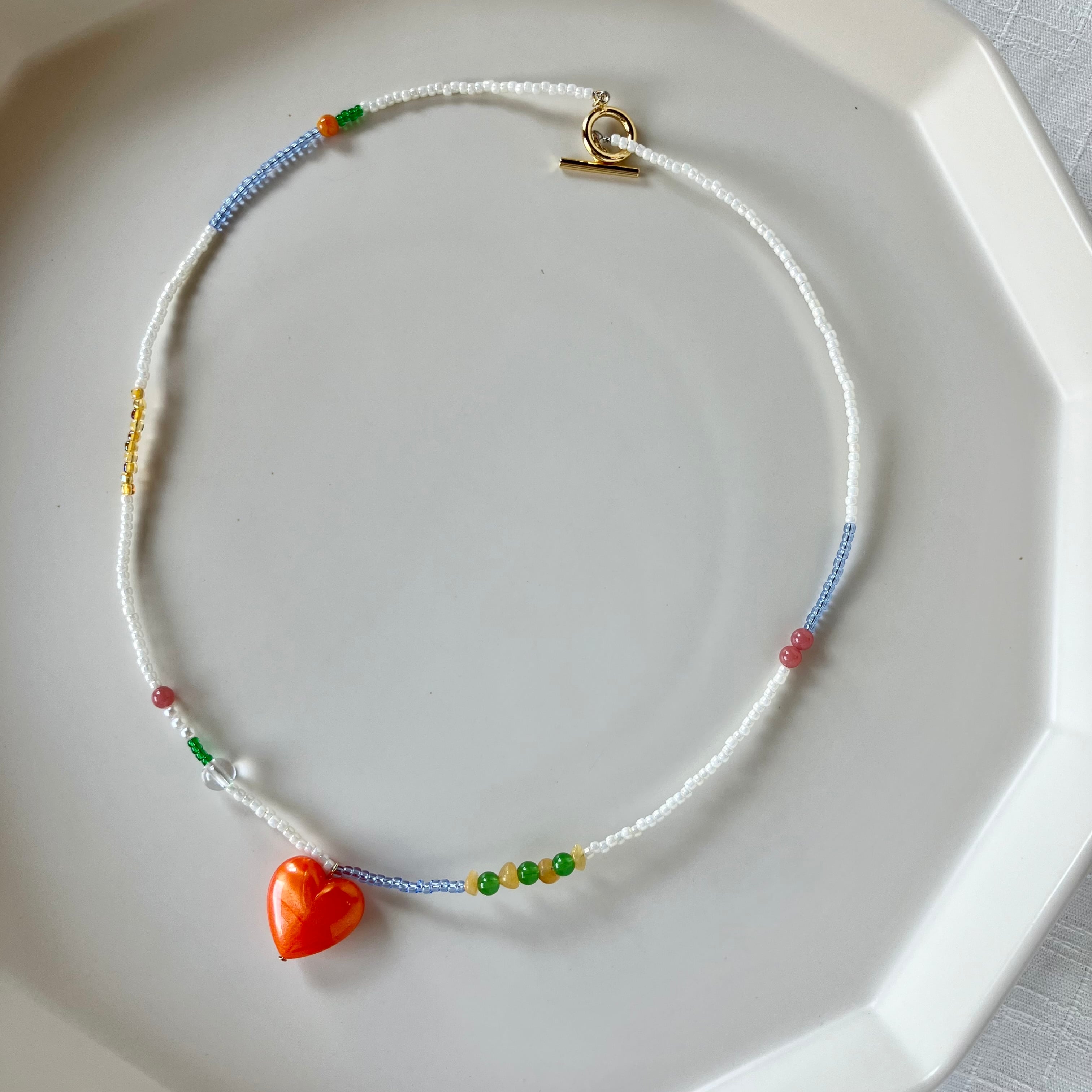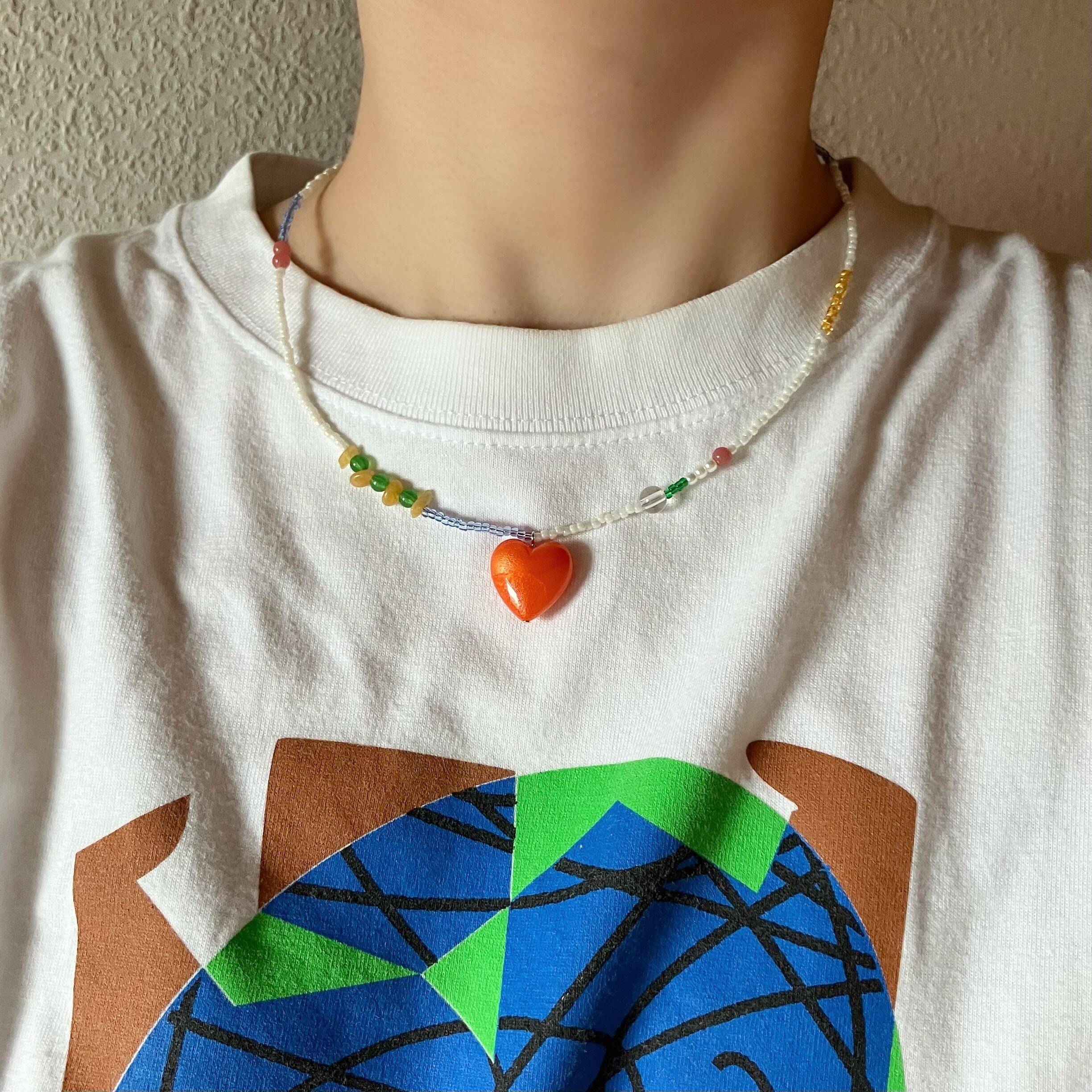 色んな形のビーズを繋ぎ合わせた、楽しい気分になれるネックレスを作りました。