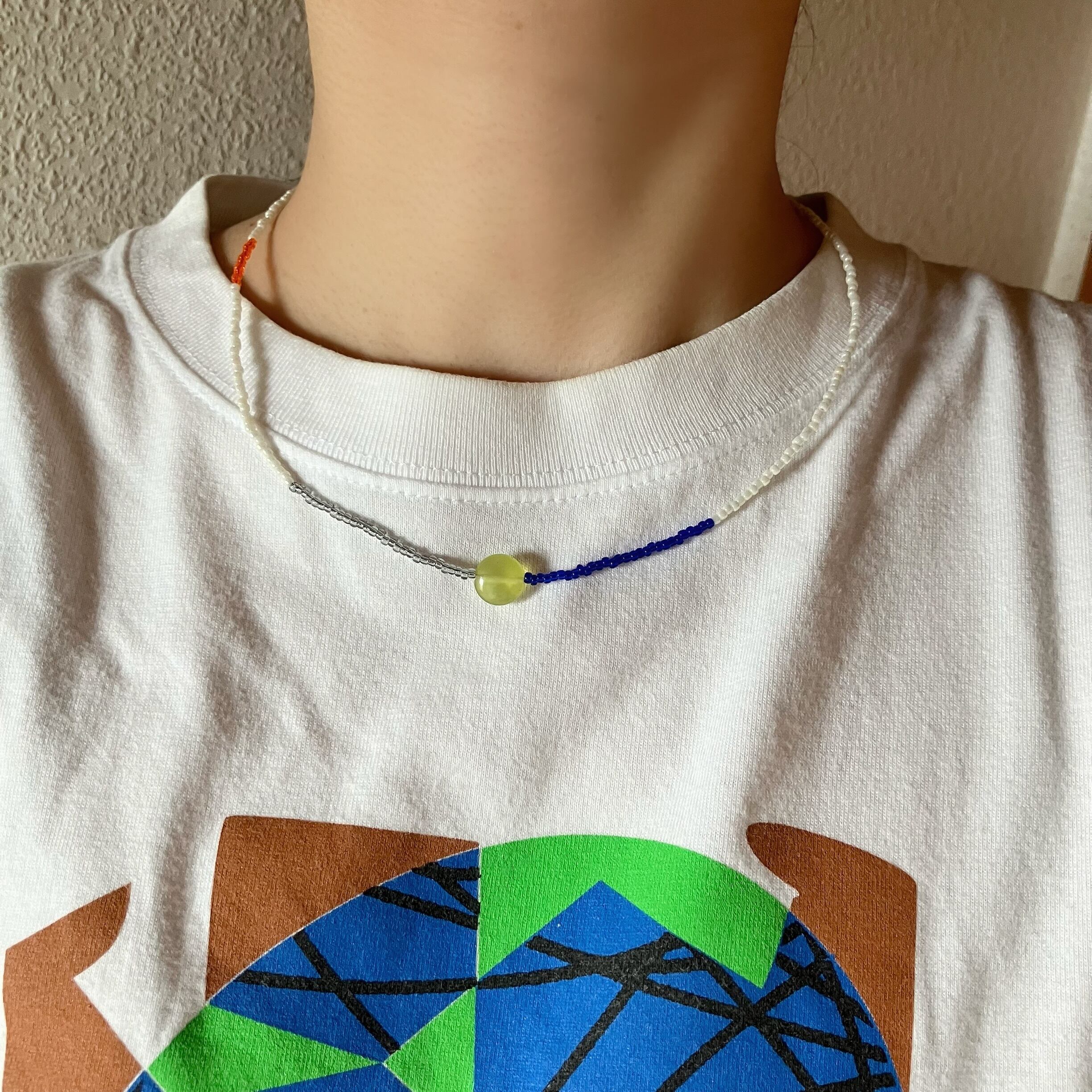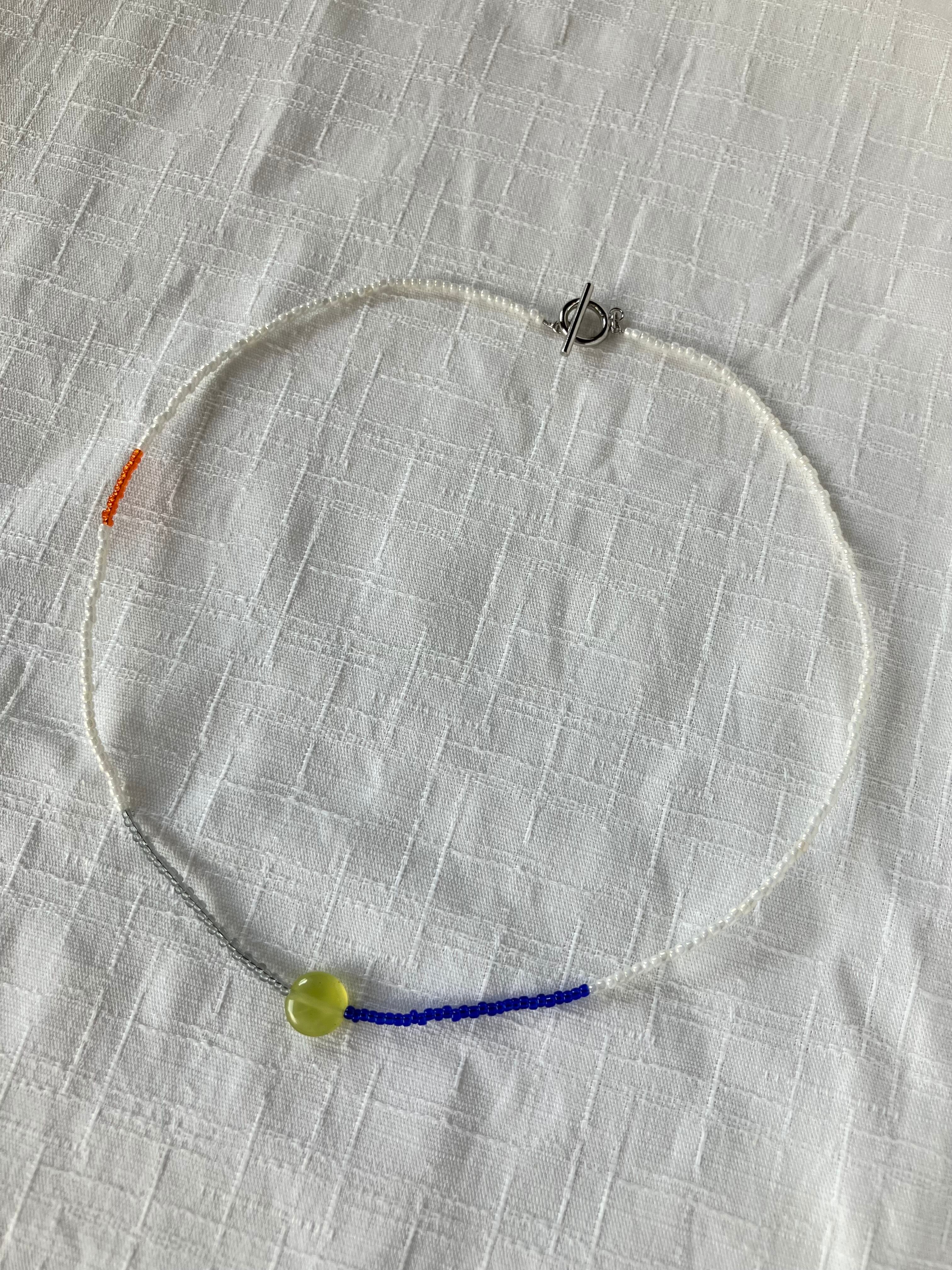 パールホワイト、ブルー、グレー、オレンジの配色に、コイン型の天然石を取り入れたシンプルながら少し個性のあるネックレス。