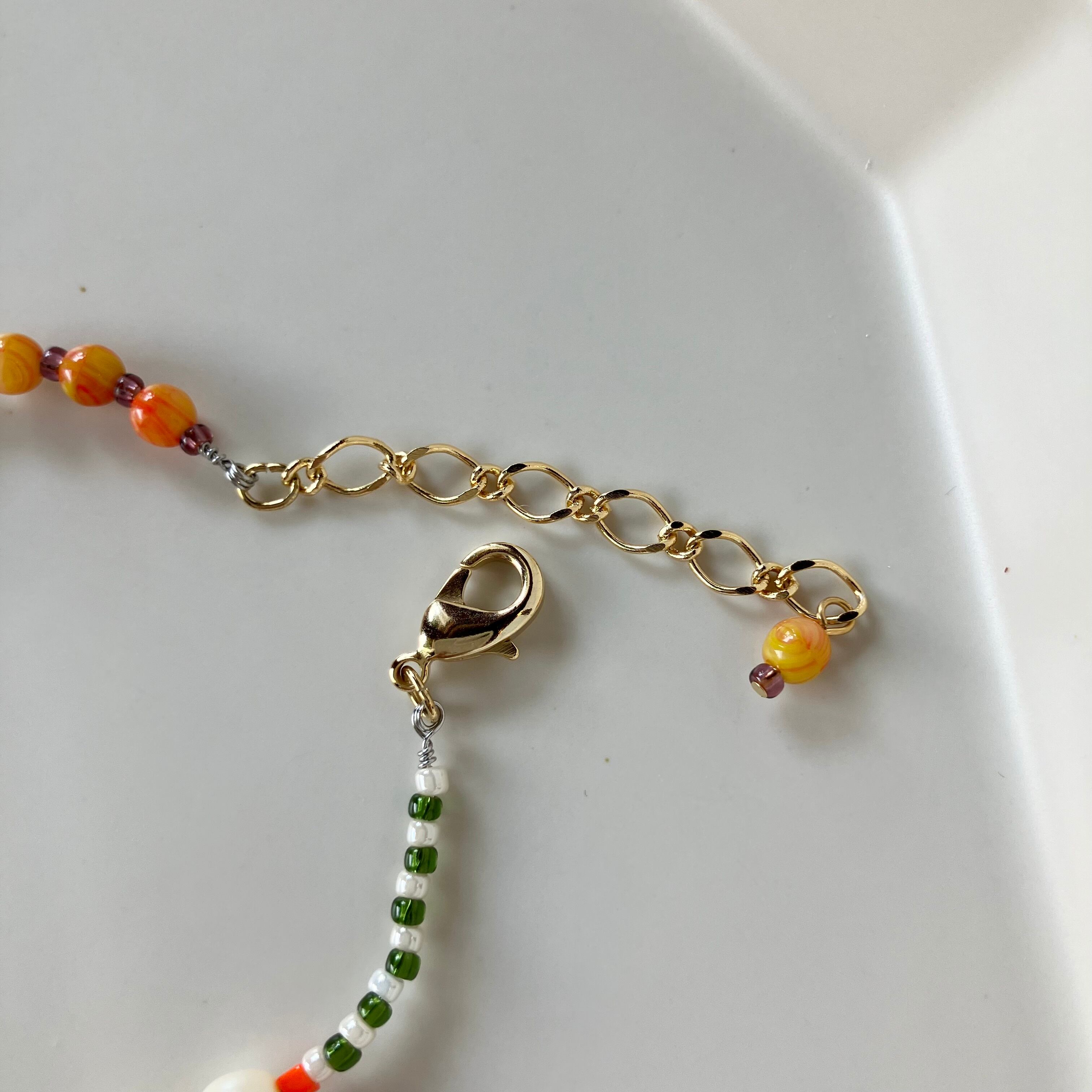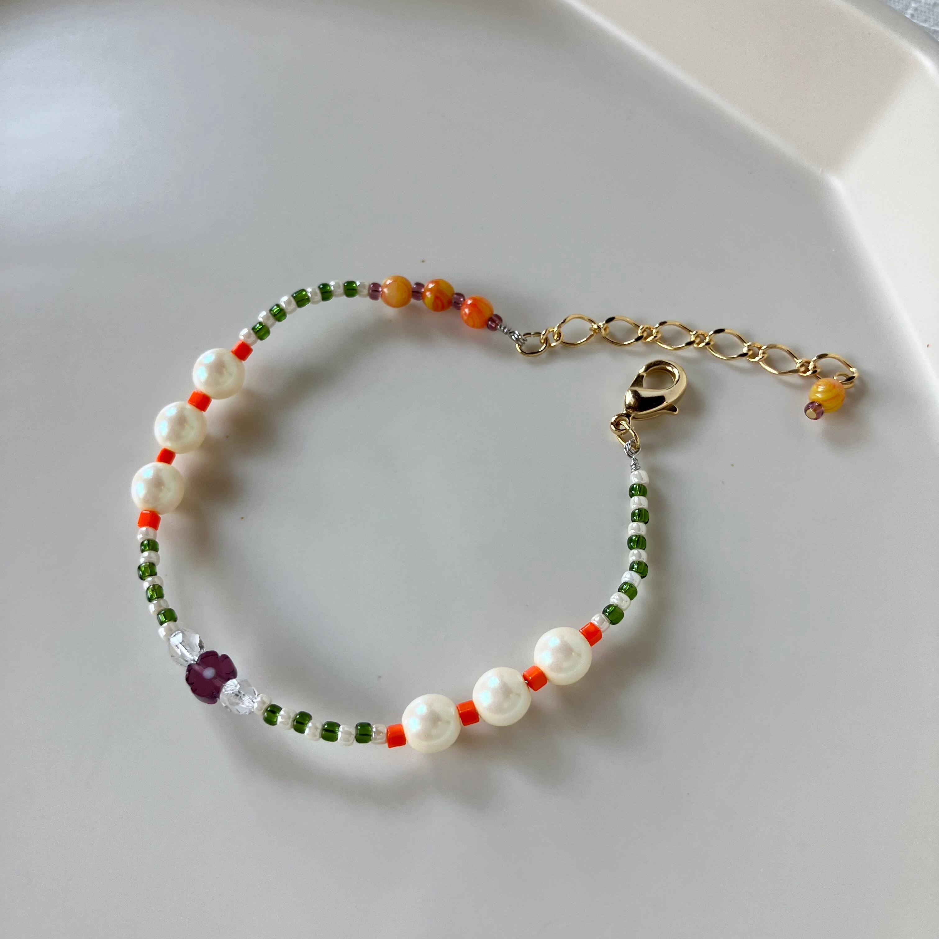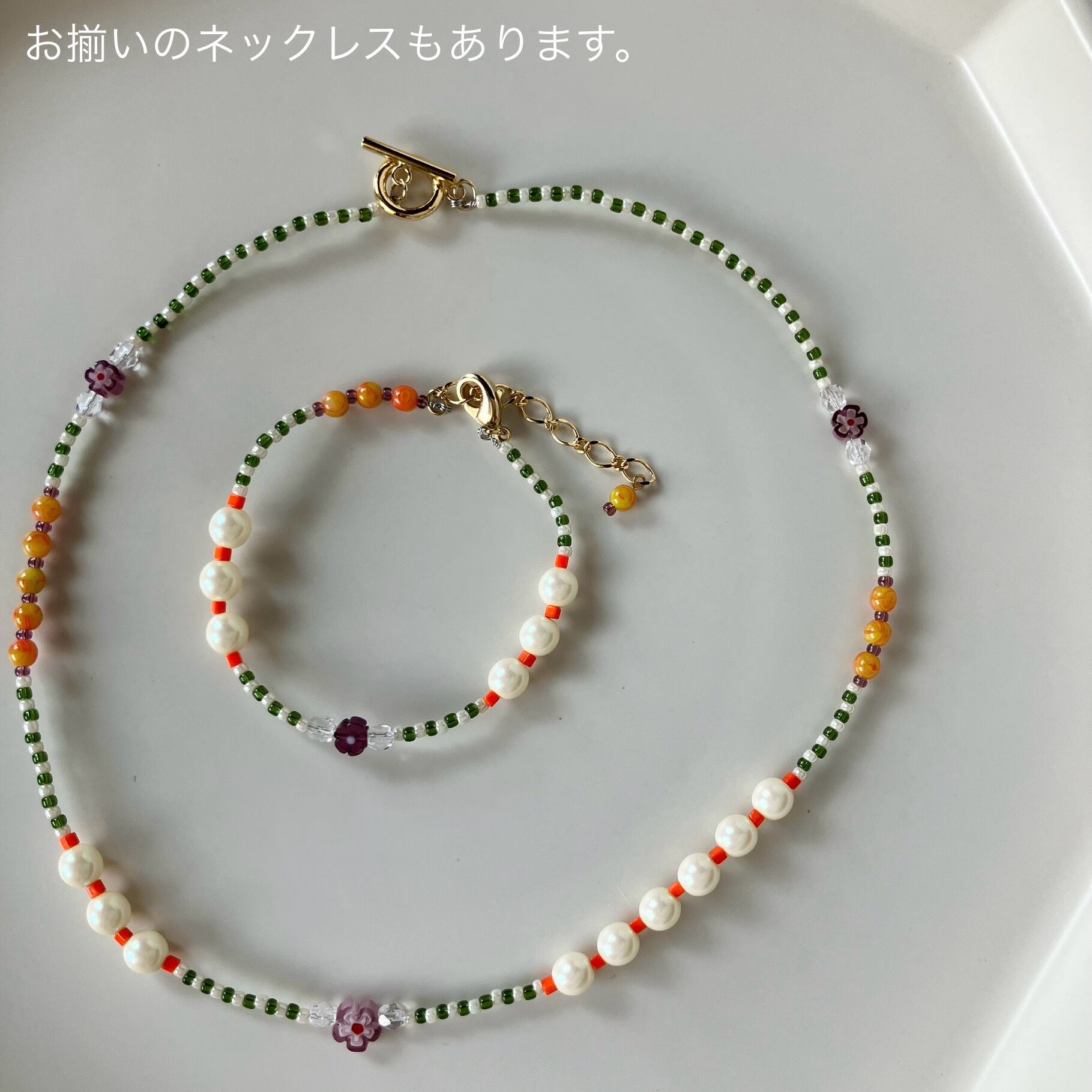 カーキとクリームパールのしましま模様に、パールビーズやお花のビーズ、マーブルオレンジのビーズなどを盛り込んだ個性的なブレスレット。