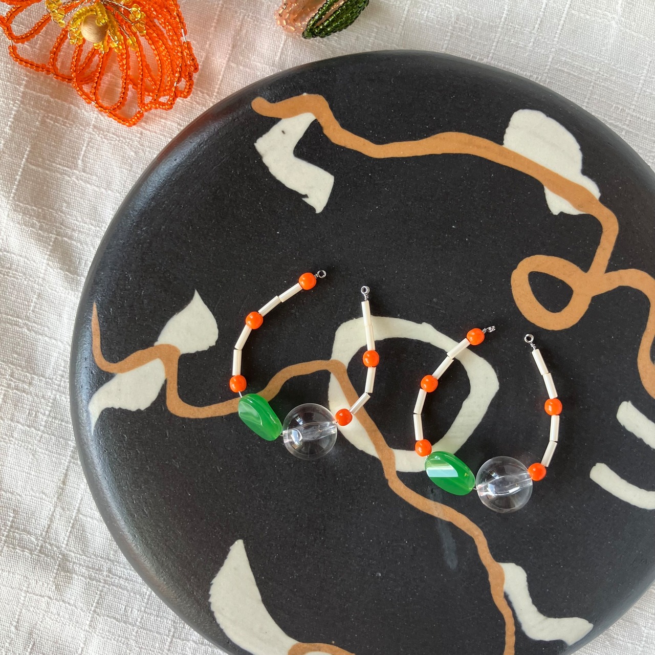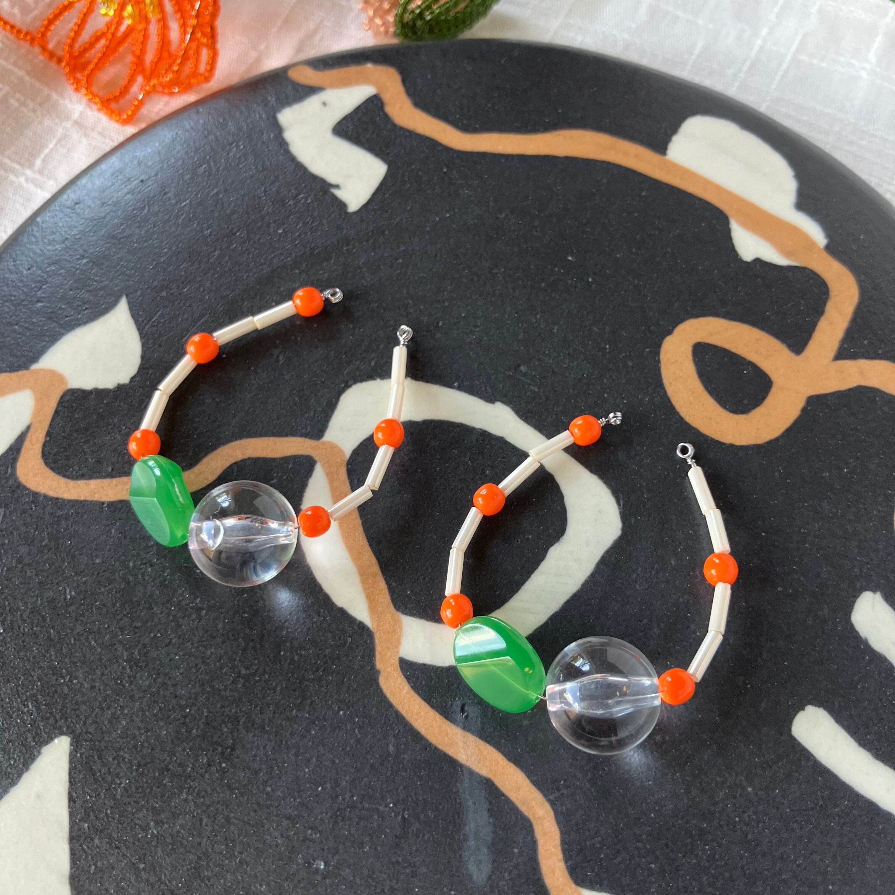 様々なガラスビーズをフープ状に繋げた、ボリュームがありながらもスッキリとした耳飾りです。