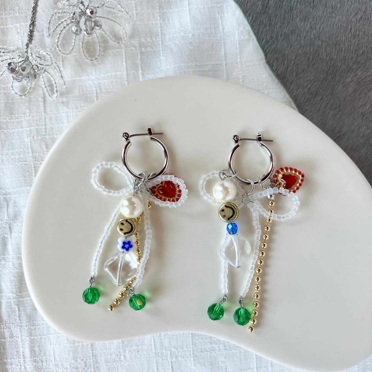 さまざまな色と形のビーズを組み合わせて、リボンの耳飾りを作りました。