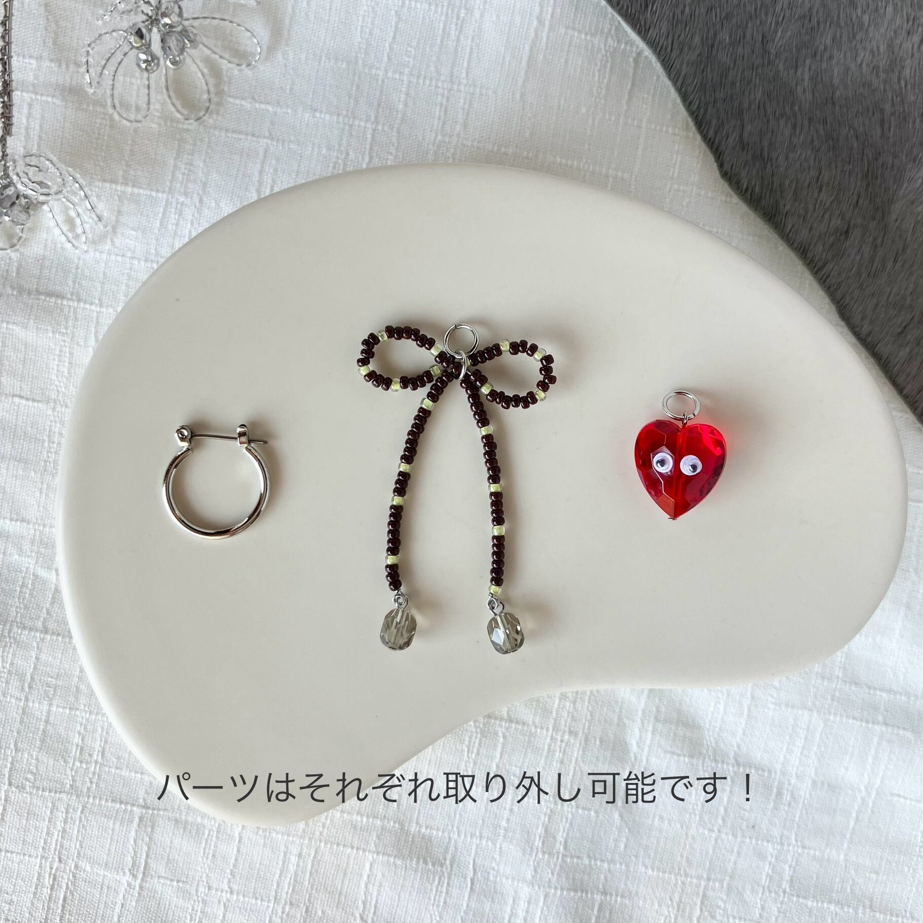 リボンを取り外して、ハートのピアスとしてもたくさん使っていただきたいです!
