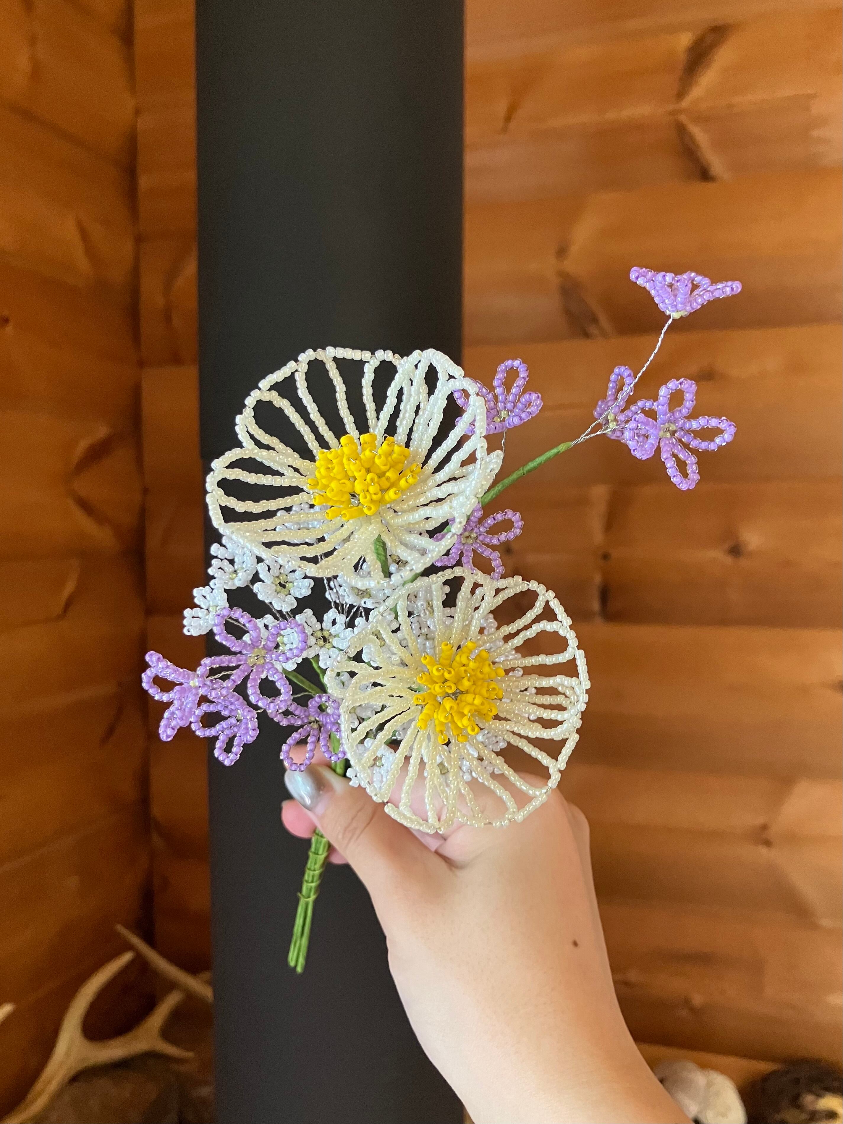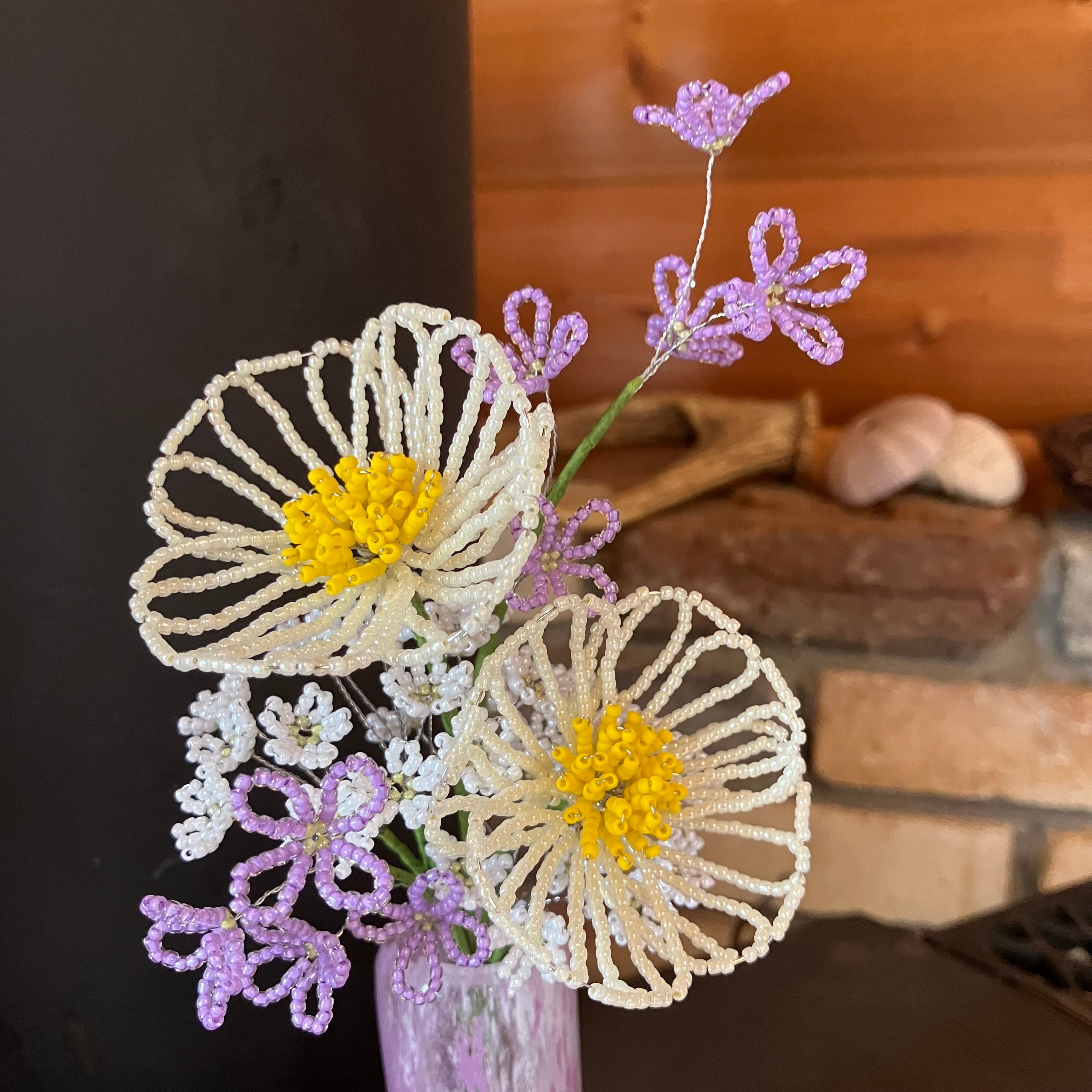 パールホワイトのビーズで作った小さなお花の間から、ぴょこっとお花が飛び出すようにまとめたのがお気に入りポイントです。