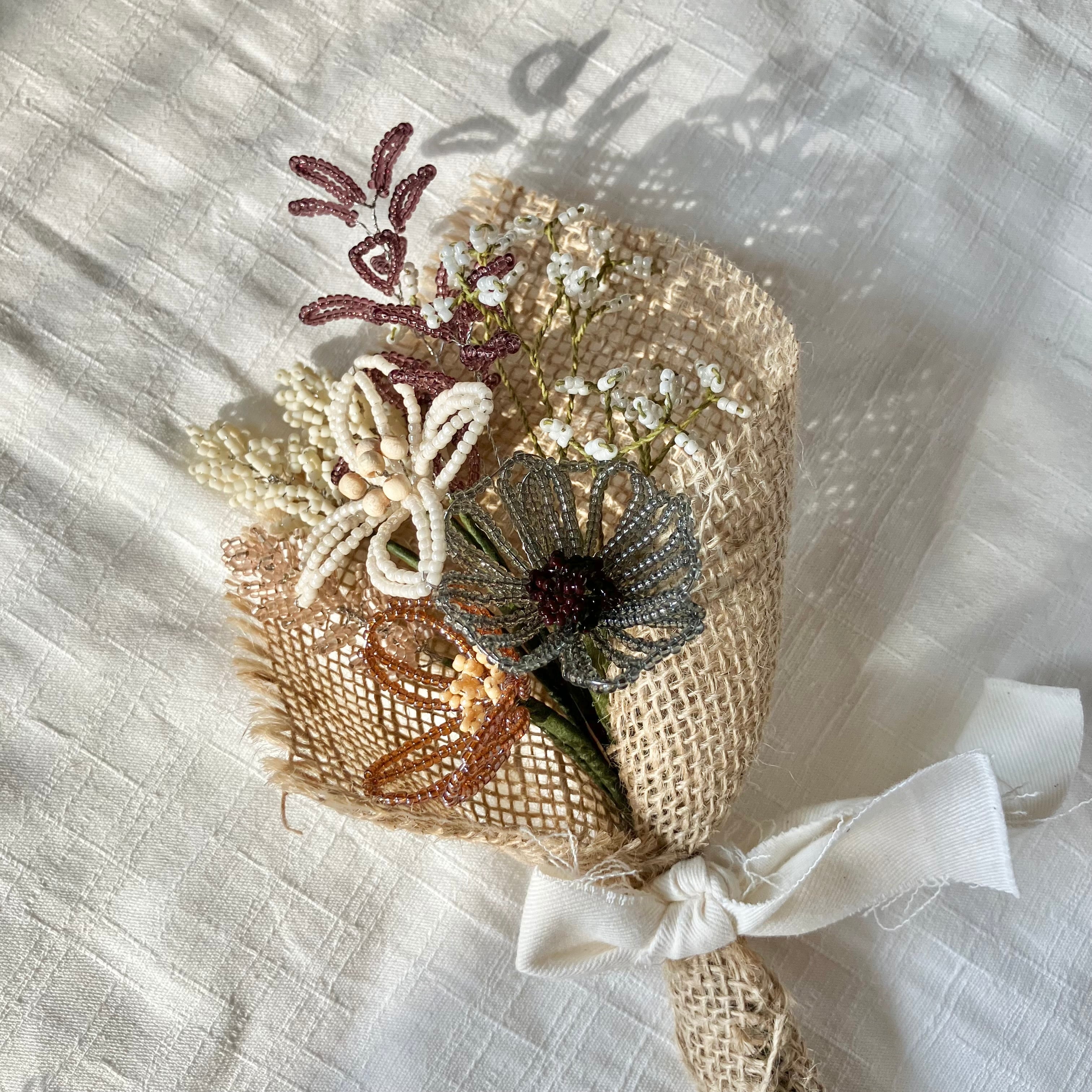 小ぶりなサイズ感とドライフラワーのような落ち着いた色味で、お部屋に馴染みやすい花束になっています。