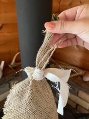 壁にかけられるループ紐がついた、スワッグ風にまとめたブーケ。