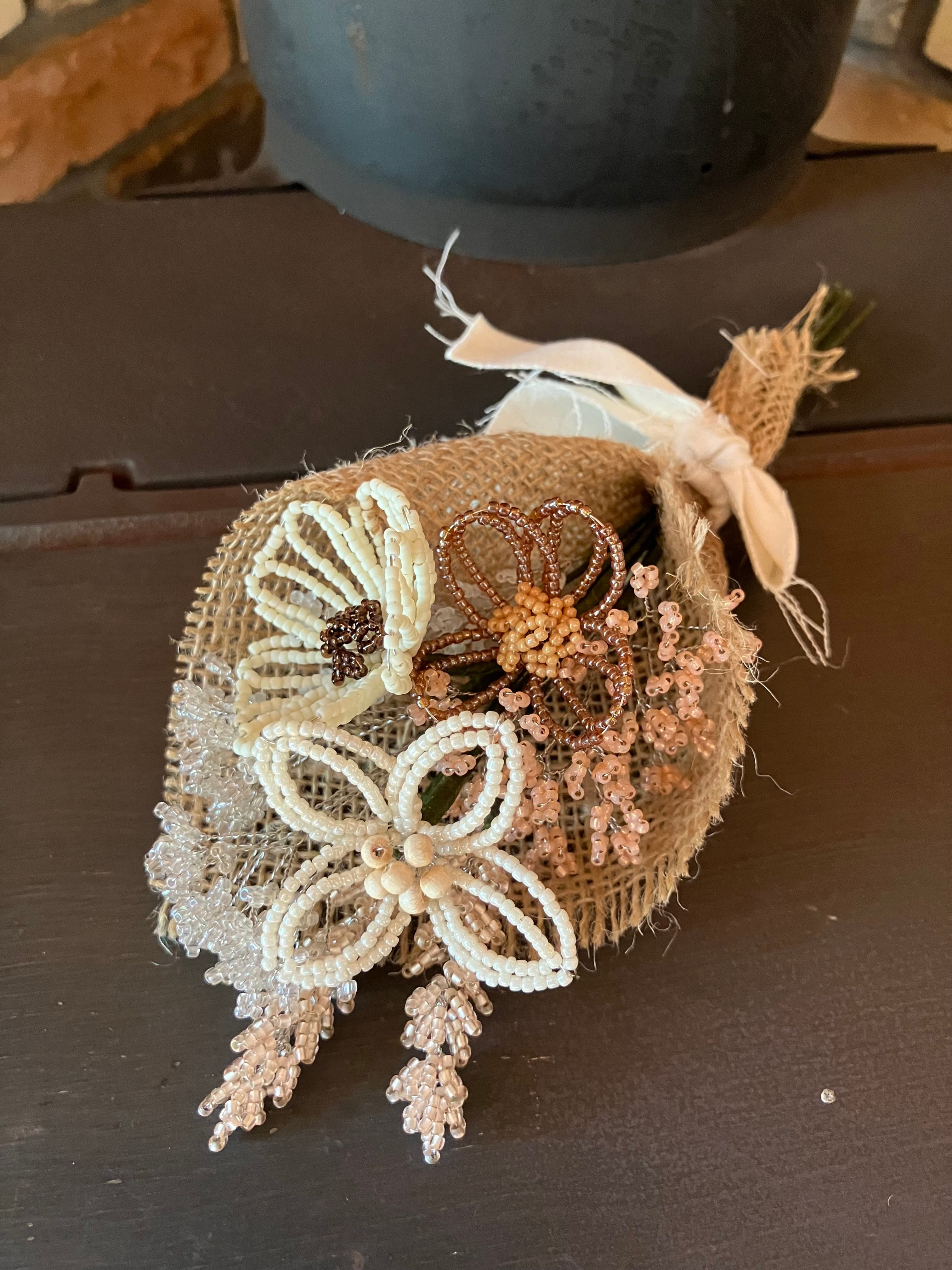 壁にかけられるループ紐がついた、スワッグ風にまとめたブーケ。