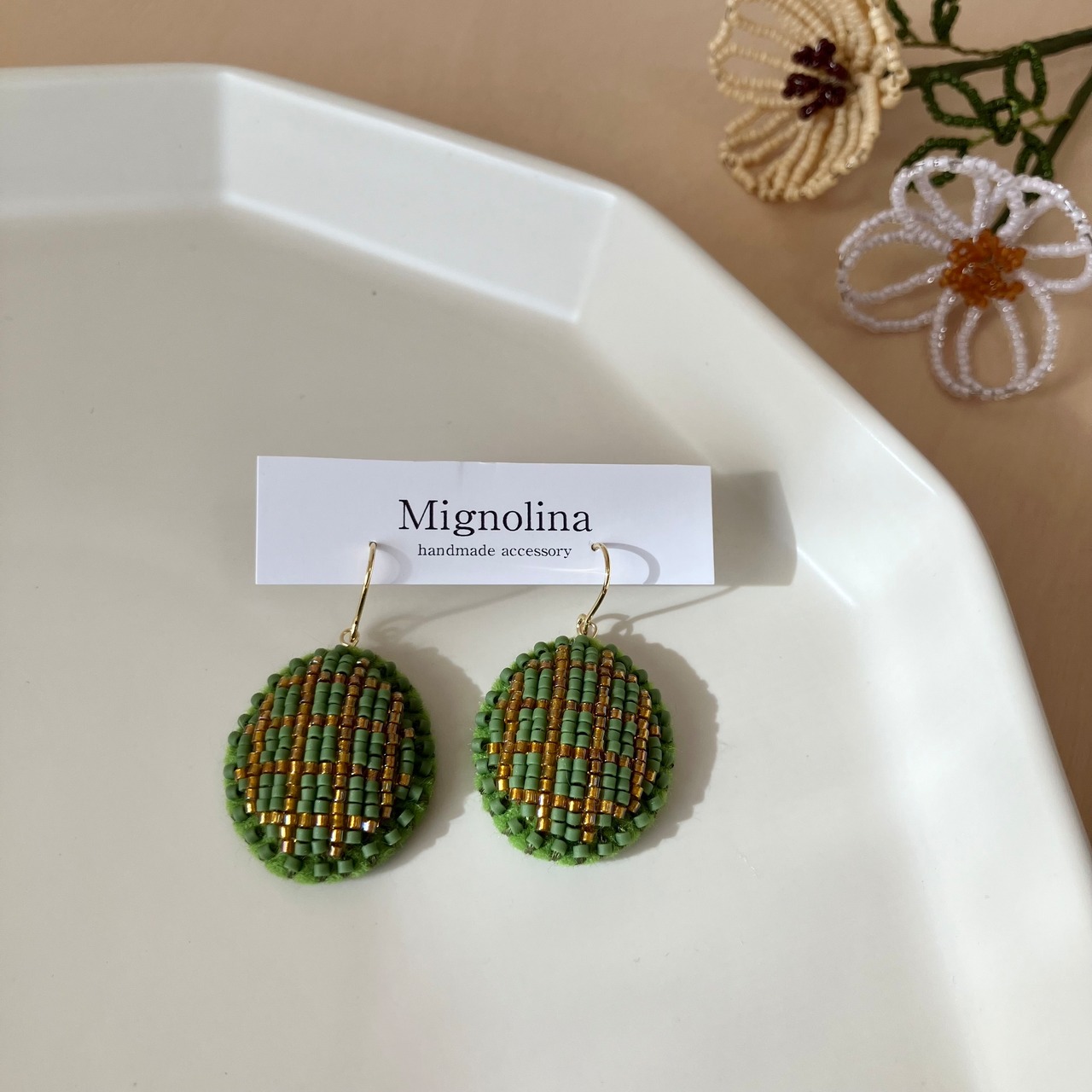 マットなカーキ色とキラッとしたクリアな茶色のチェック柄。