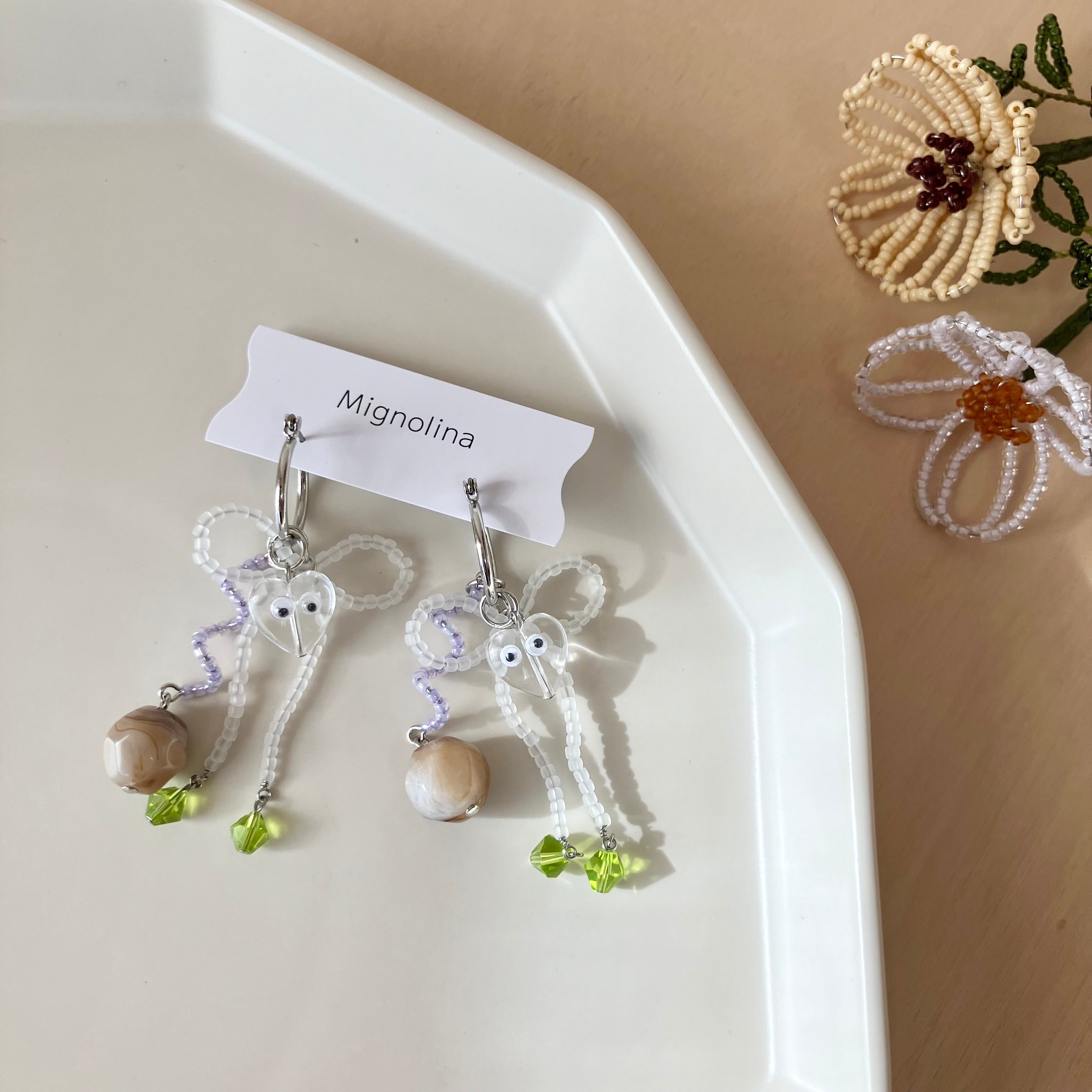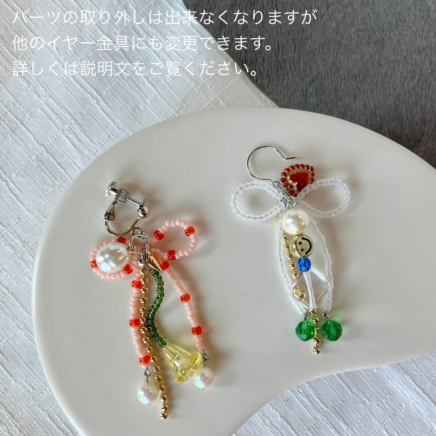 さまざまな色と形のビーズを組み合わせて、リボンの耳飾りを作りました。