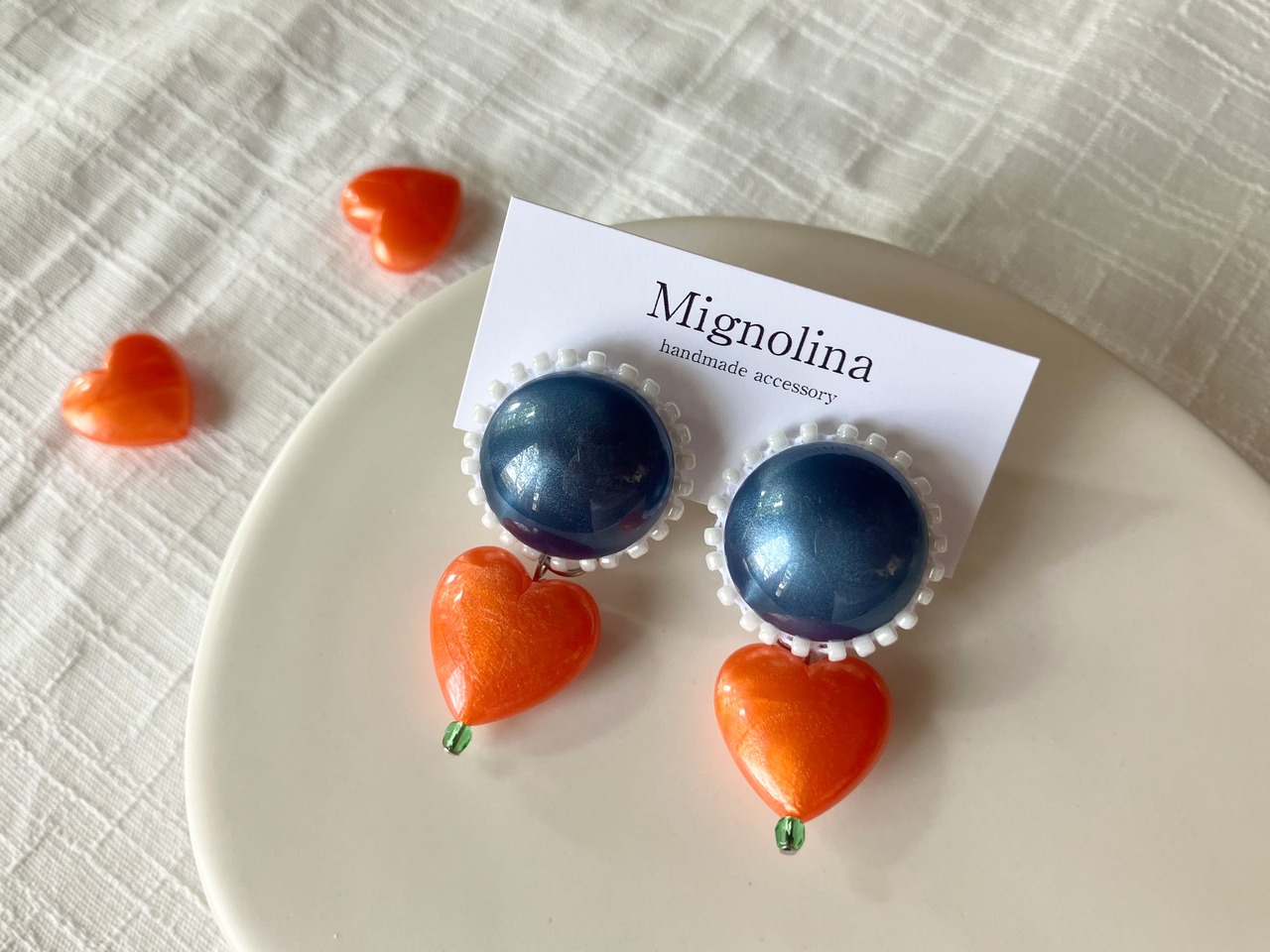 パール加工のメタリックなネイビーブルーのモチーフと、細かいラメがマーブルされた鮮やかなオレンジのハートビーズを合わせた目を引くポップな耳飾り。