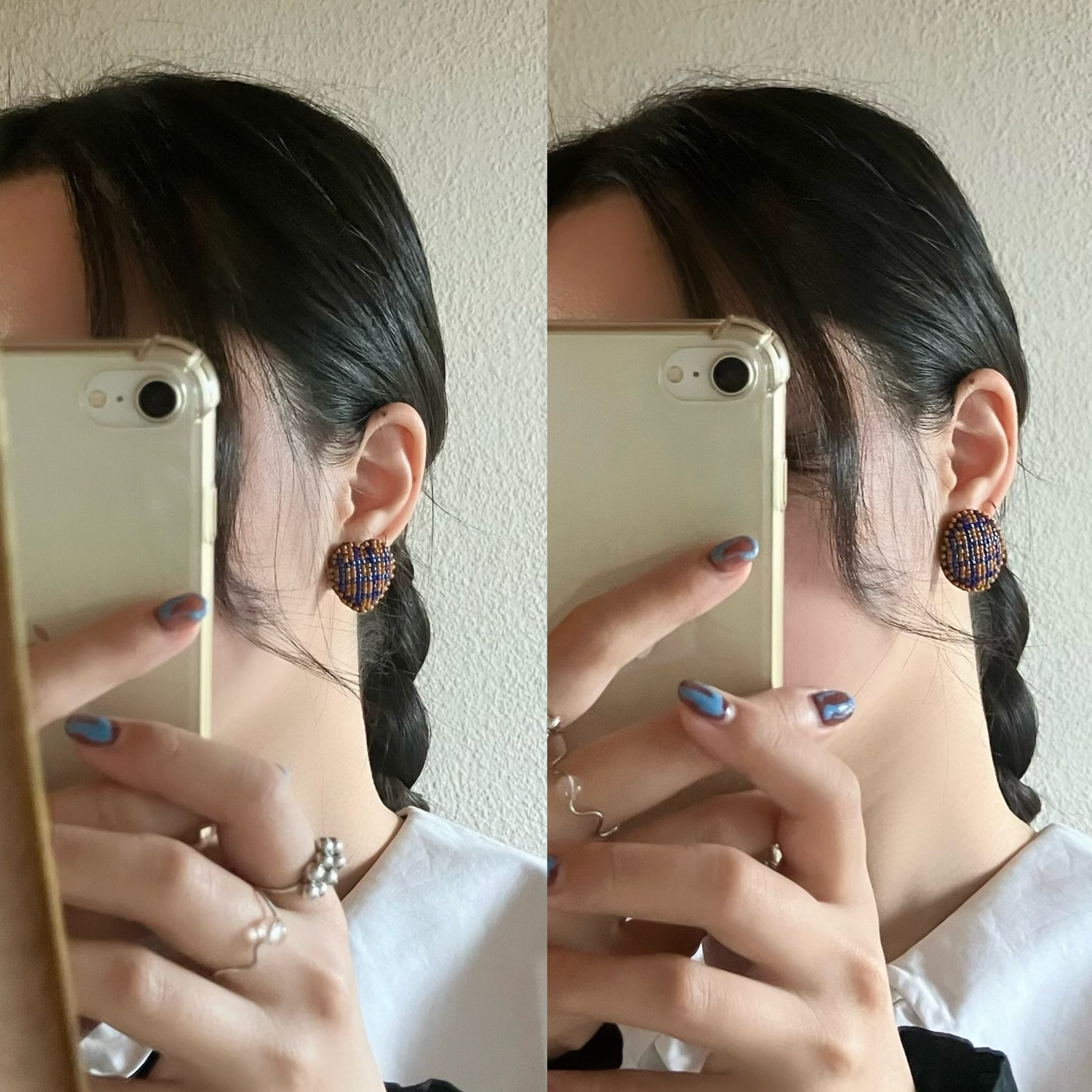 キラキラと反射するネイビーのビーズとのバランスが秋冬らしいアイテムになりました。